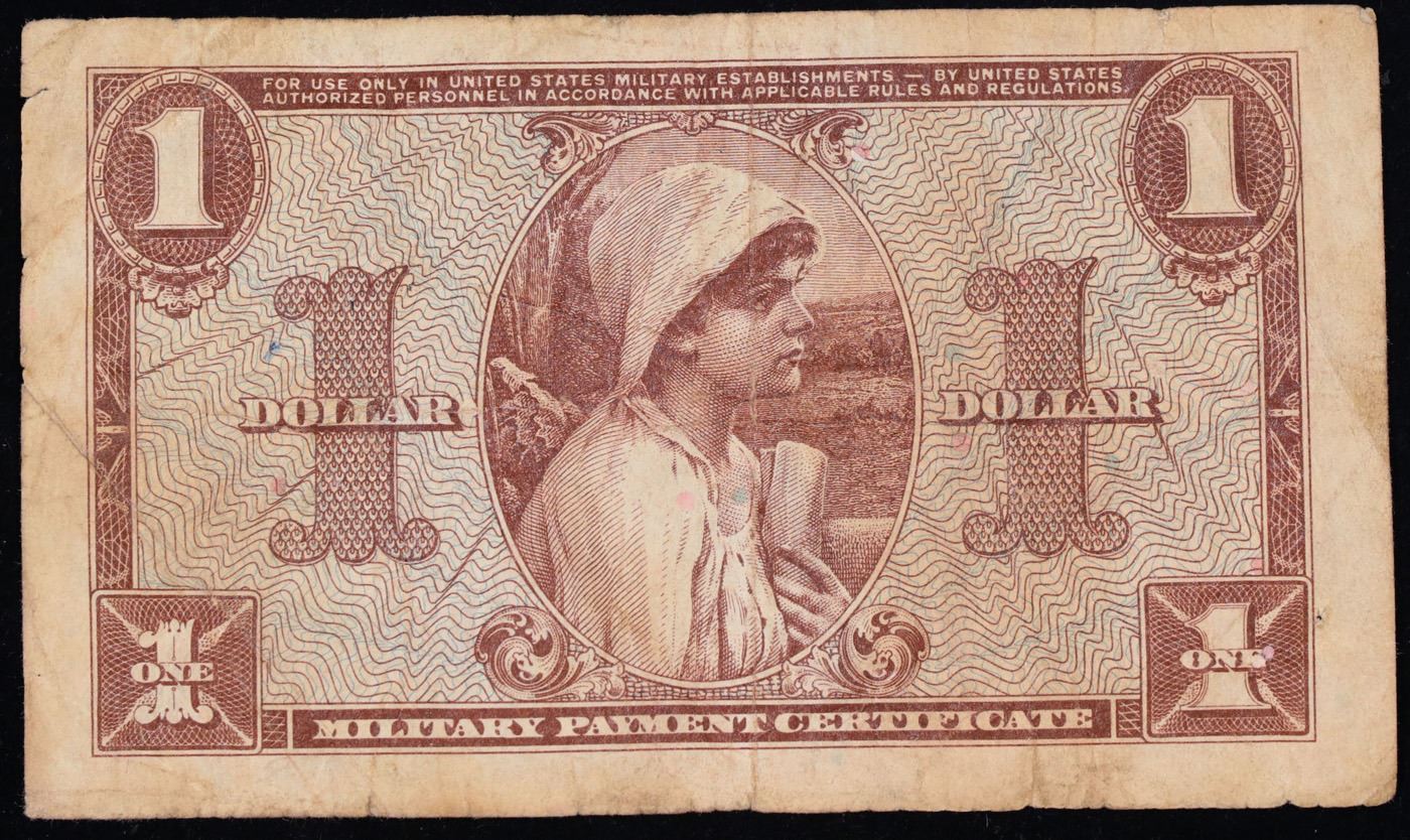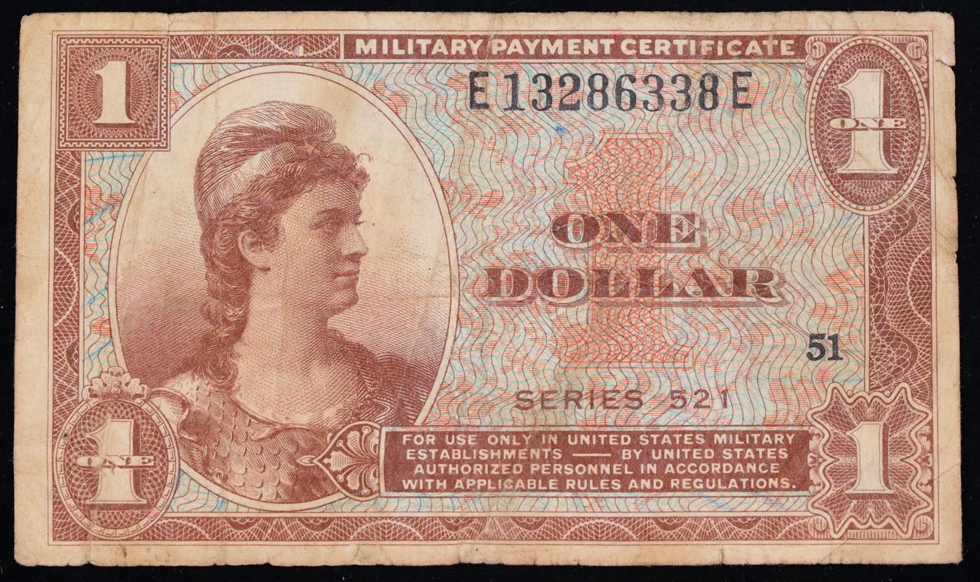 Military Payment Certificate (MPC) Rare Series 521 1 Dollar Fr-M845 Grades vf+. One really neat thing about series 521 military payment certificates is that they were the first issue to have the denomination of each note printed on the reverse. All previous issues just had a standard generic design on the backs. This also marked the first time that Forbes Lithograph Corporation was responsible for the entire printing. Forbes incorporated “real people” into the designs of the one, five, and ten dollar denominations instead of the previous classically inspired designs. Series 521 MPCs were used in 19 different countries between May 25th, 1954 and May 27th, 1958.