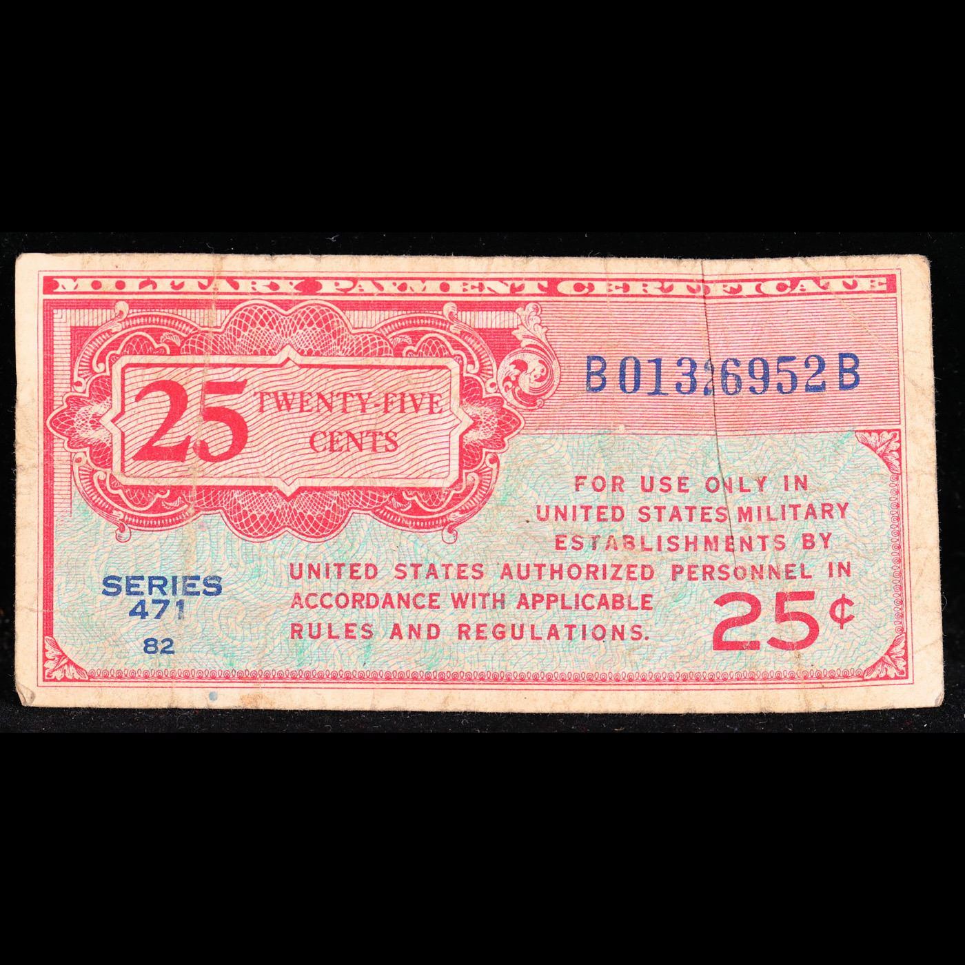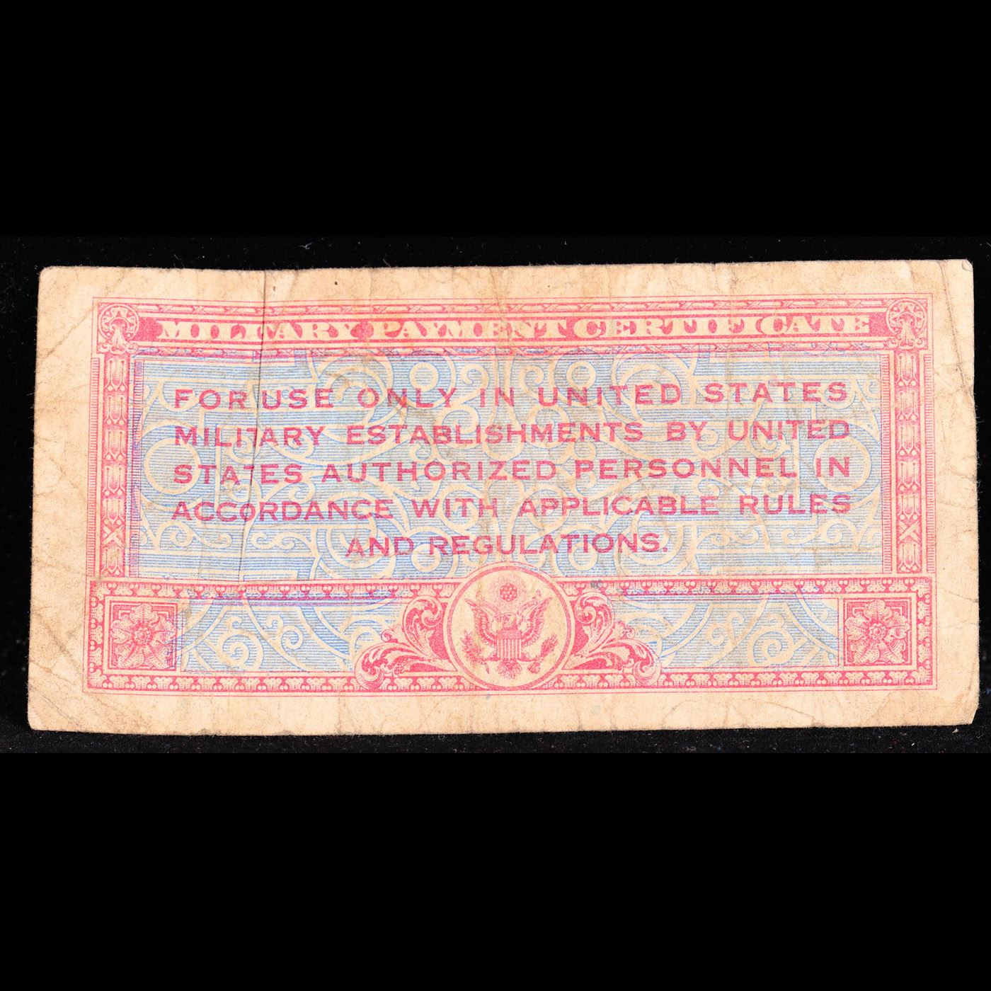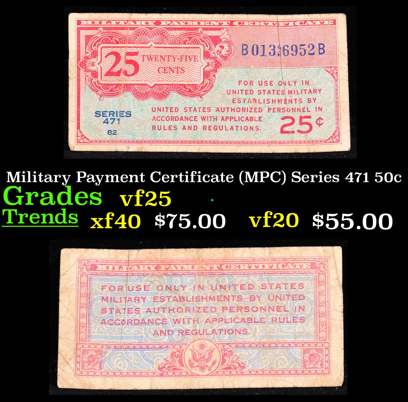 Military Payment Certificate (MPC) Series 471 50c Grades vf+. The second type of military payment certificate issued by the United States is known as the series 471. They were only used by our troops for about a year. March 10th, 1947 was their introduction date and they were redeemed on March 22nd, 1948 The design of 471 notes is exactly the same as the earlier 461 series. They were also printed by Tudor Press in Boston. The only difference is that these have a pink color instead of blue. These were also printed for seven different denominations. Each note should have a serial number that begins and ends with the letter B. If the serial number doesn’t end with the letter B, then you have a replacement note. All replacements are rare for series 471 MPCs