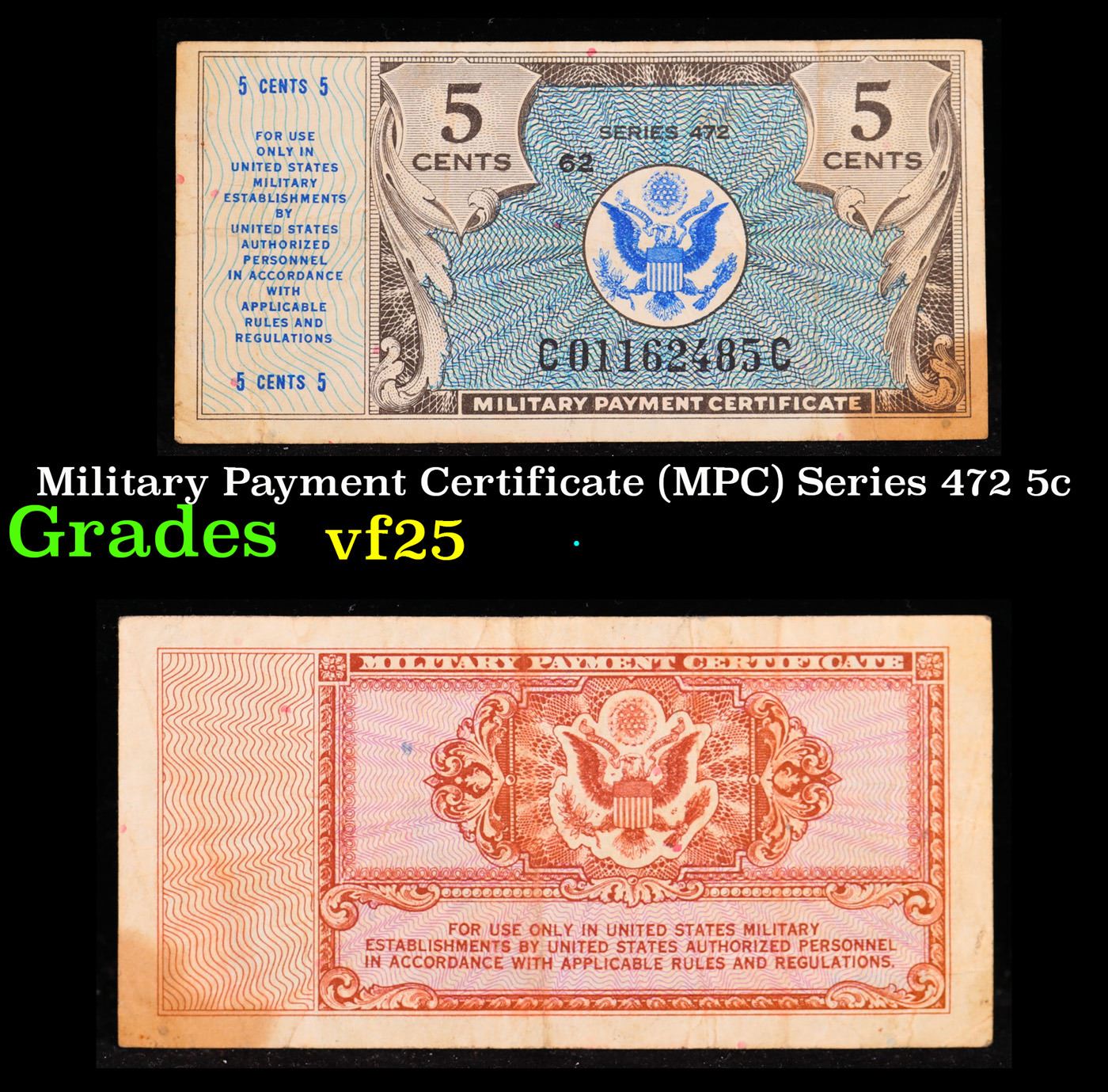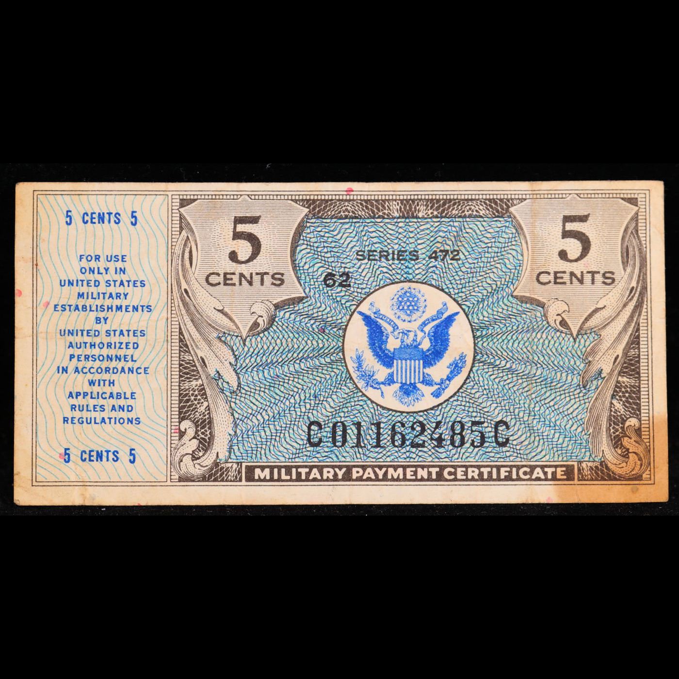 Military Payment Certificate (MPC) Series 472 5c Grades vf+. Series 472 military payment certificates were printed by Tudor Press in Boston, MA. They also had a new design from previous issues. They almost look like a stub and check layout. Series 472 was the first issue to use different print runs. Print runs produce some rarities that would not otherwise exist.