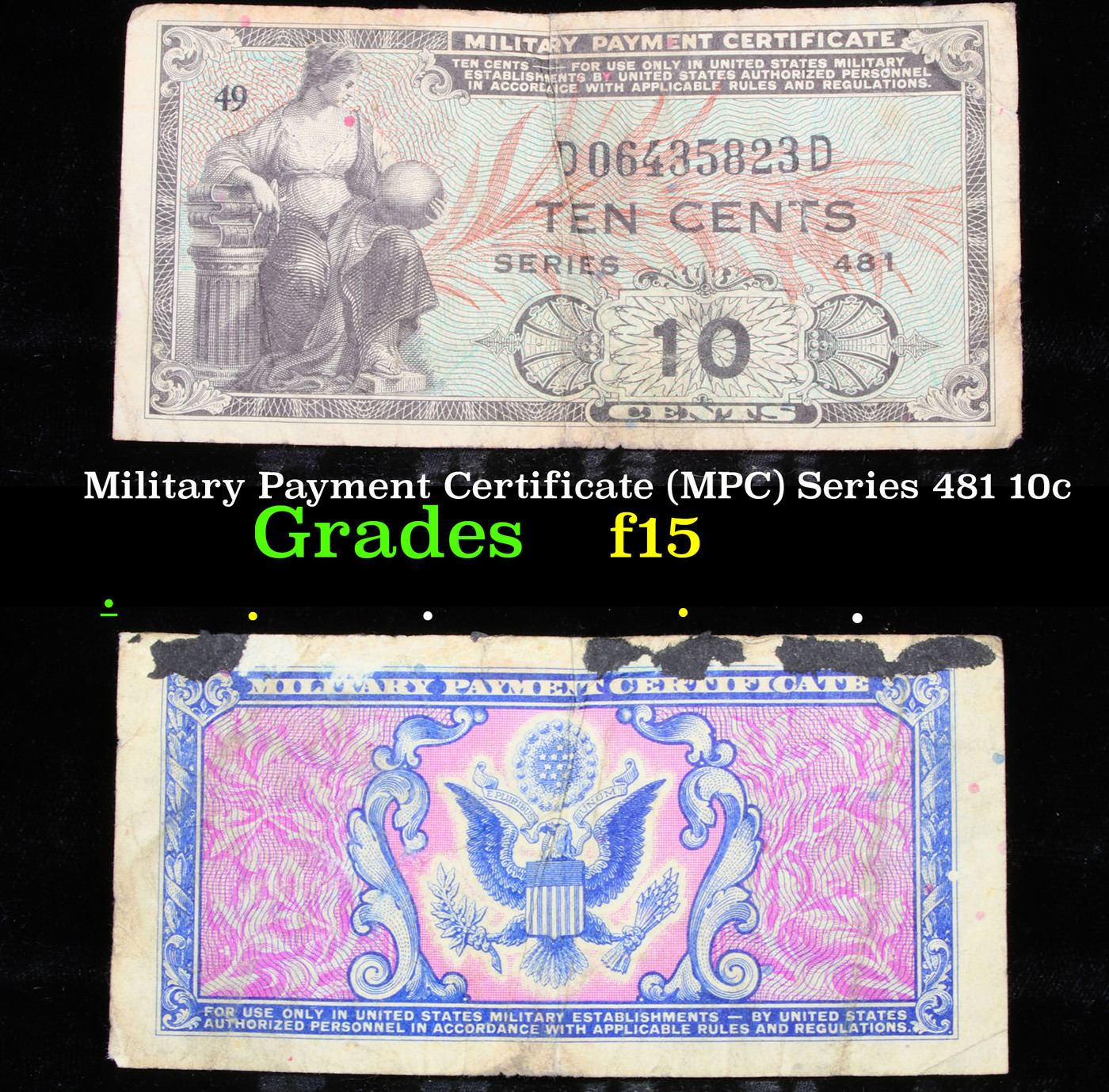 Military Payment Certificate (MPC) Series 481 10c f+. Military payment certificates, or MPC, were a form of currency used to pay U.S. military personnel in certain foreign countries. They were used in one area or another from a few months after the end of World War II until a few months after the end of U.S. participation in the Vietnam War – from 1946 until 1973. MPC utilized layers of line lithography to create colorful banknotes that could be produced cheaply. Fifteen series of MPCs were created. However, only 13 series were issued. The remaining two were largely destroyed, although some examples remain. Among the 13 released series a total of 94 notes are recognized.