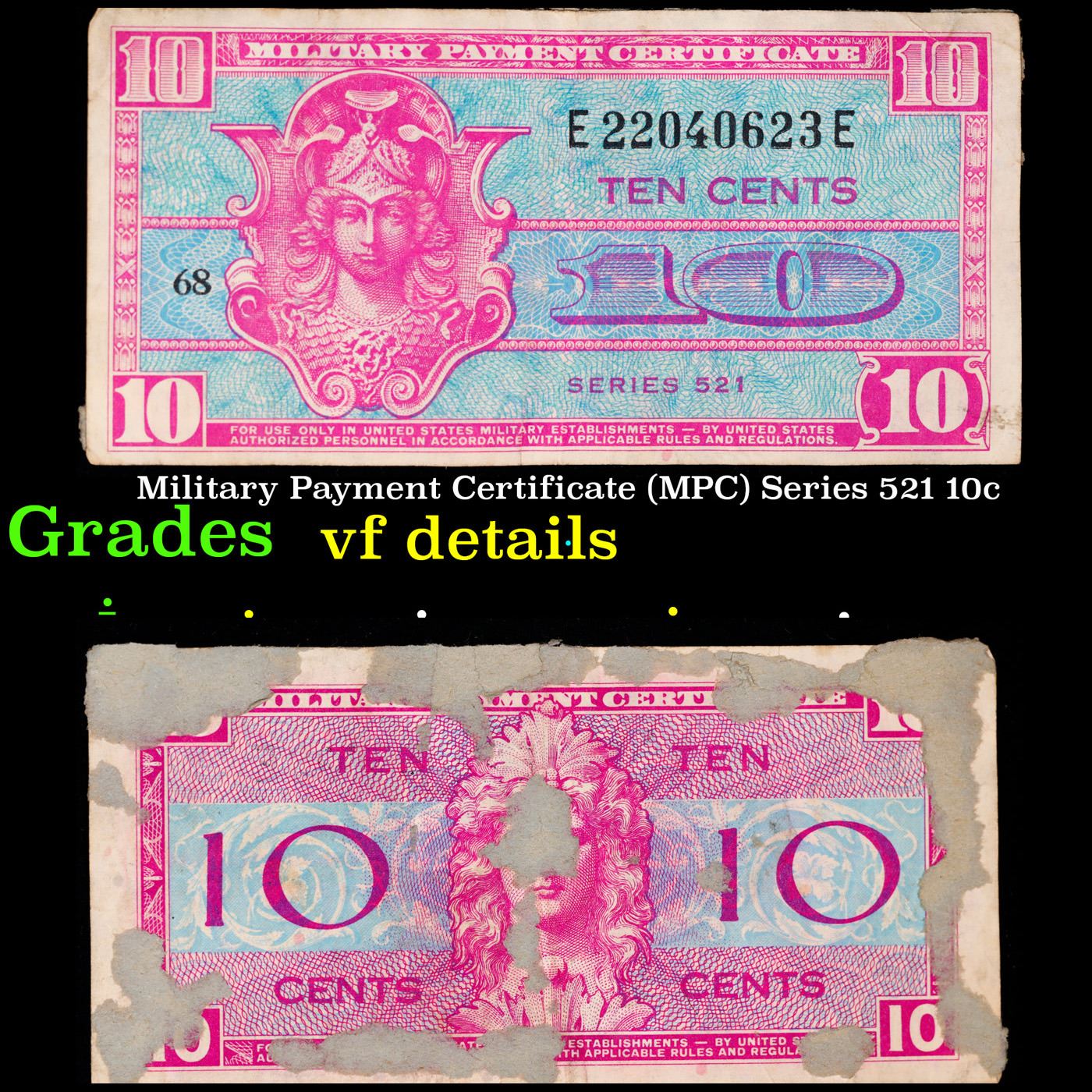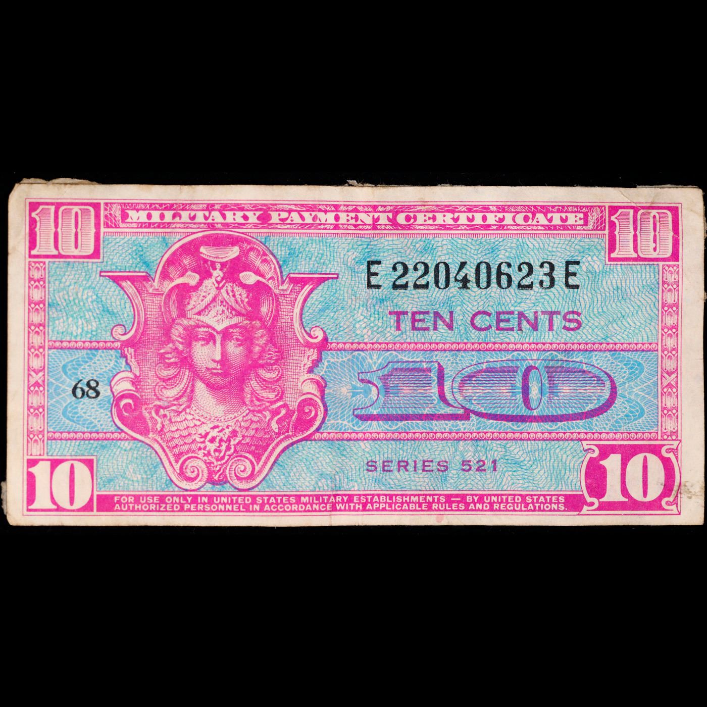 Military Payment Certificate (MPC) Series 521 10c Grades vf details. Military payment certificates (MPC) were used to pay US military personnel stationed in foreign countries. They were created in order to reduce currency arbitrage. These MPCs could be redeemed for US dollars when a soldier left an MPC zone. If a soldier went on leave then the MPCs could be converted into local currency.