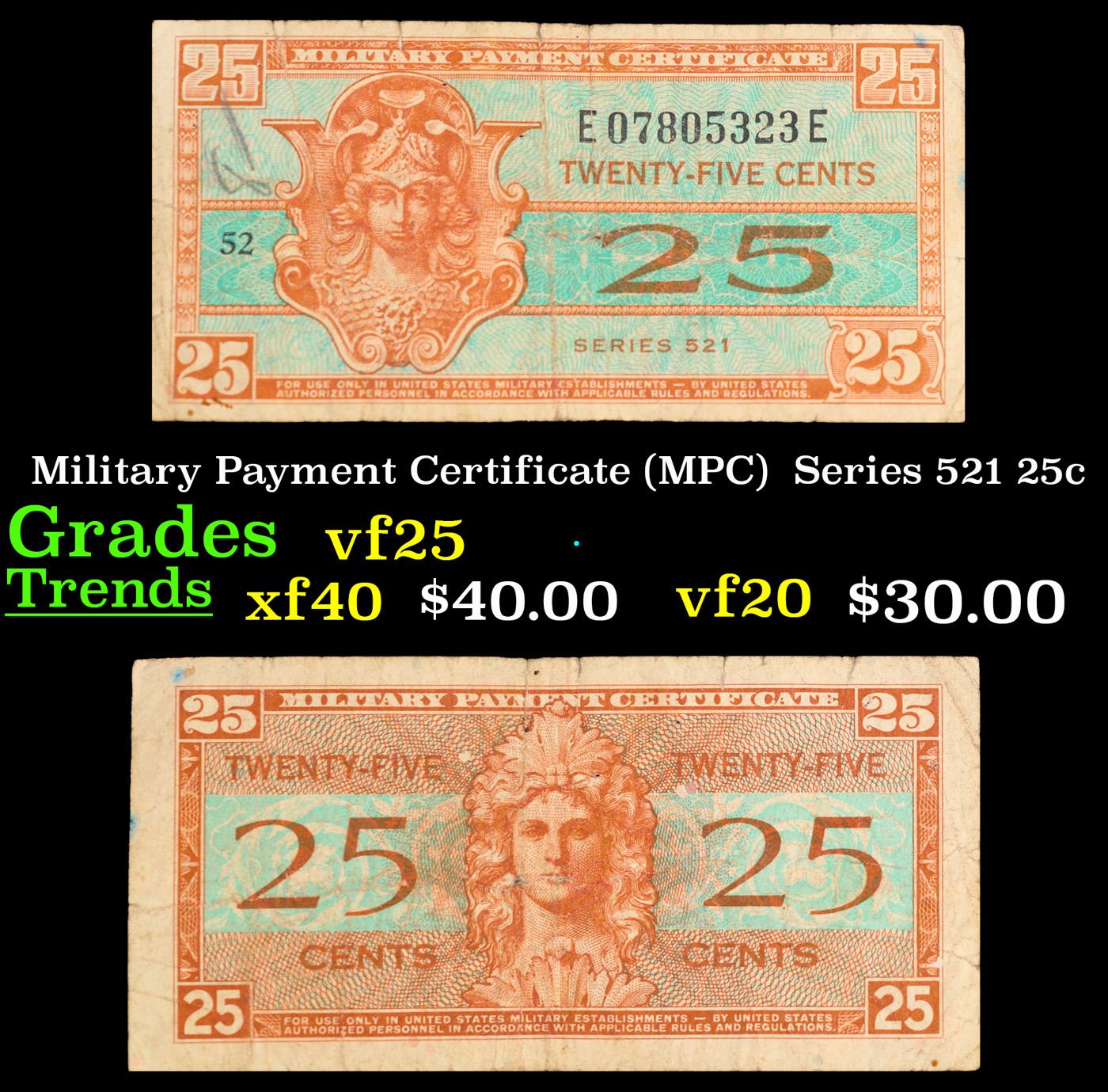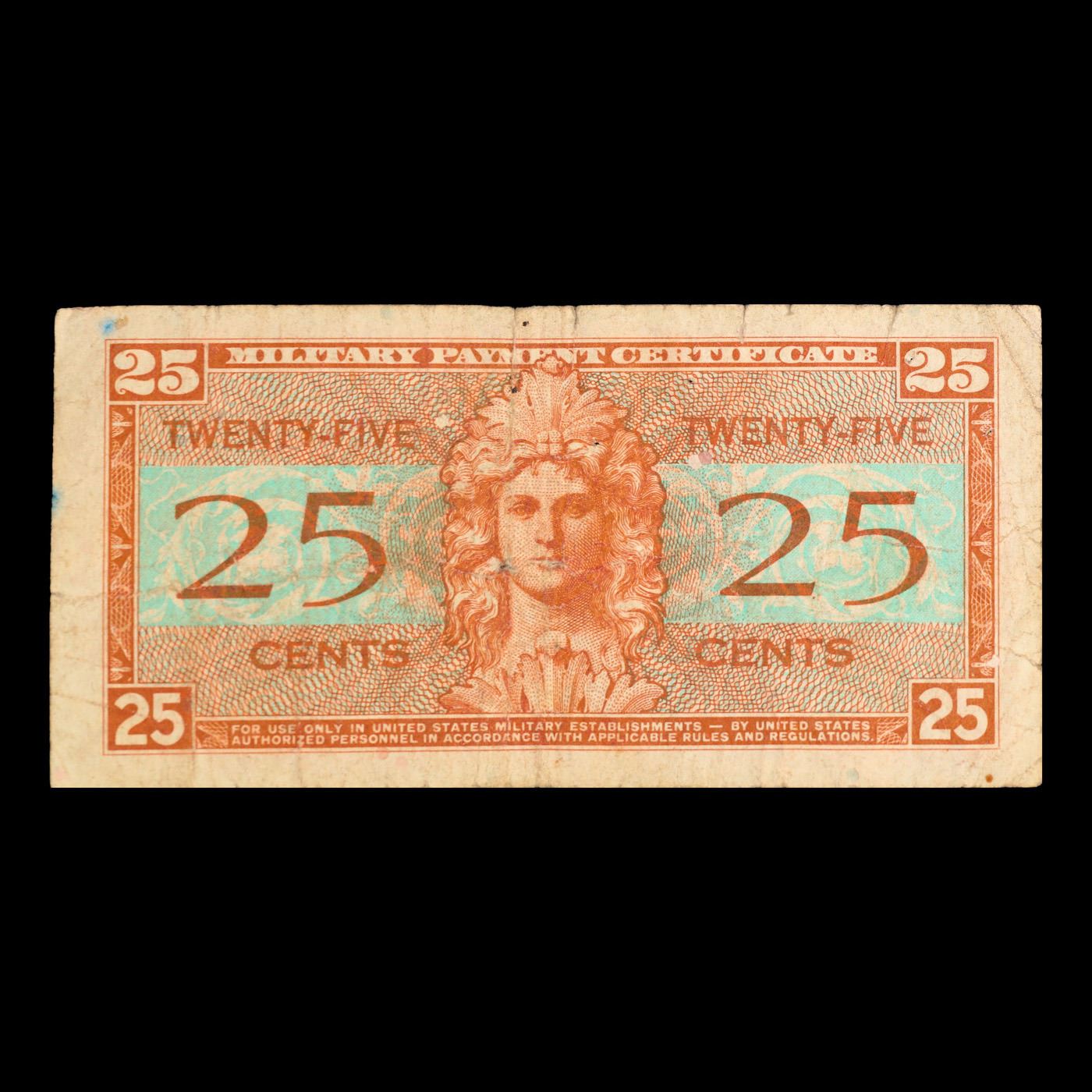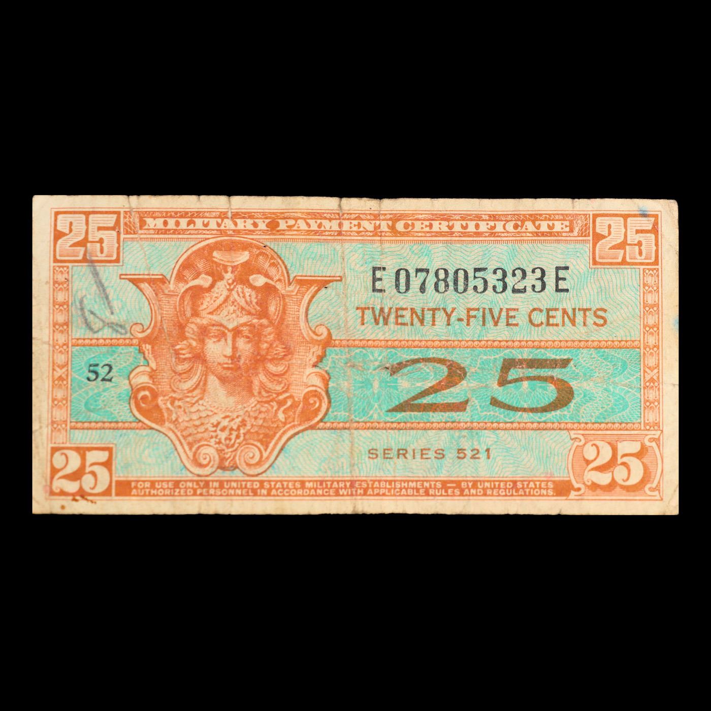 Military Payment Certificate (MPC) Series 521 25c Grades vf+. One really neat thing about series 521 military payment certificates is that they were the first issue to have the denomination of each note printed on the reverse. All previous issues just had a standard generic design on the backs. This also marked the first time that Forbes Lithograph Corporation was responsible for the entire printing. Forbes incorporated “real people” into the designs of the one, five, and ten dollar denominations instead of the previous classically inspired designs. Series 521 MPCs were used in 19 different countries between May 25th, 1954 and May 27th, 1958.