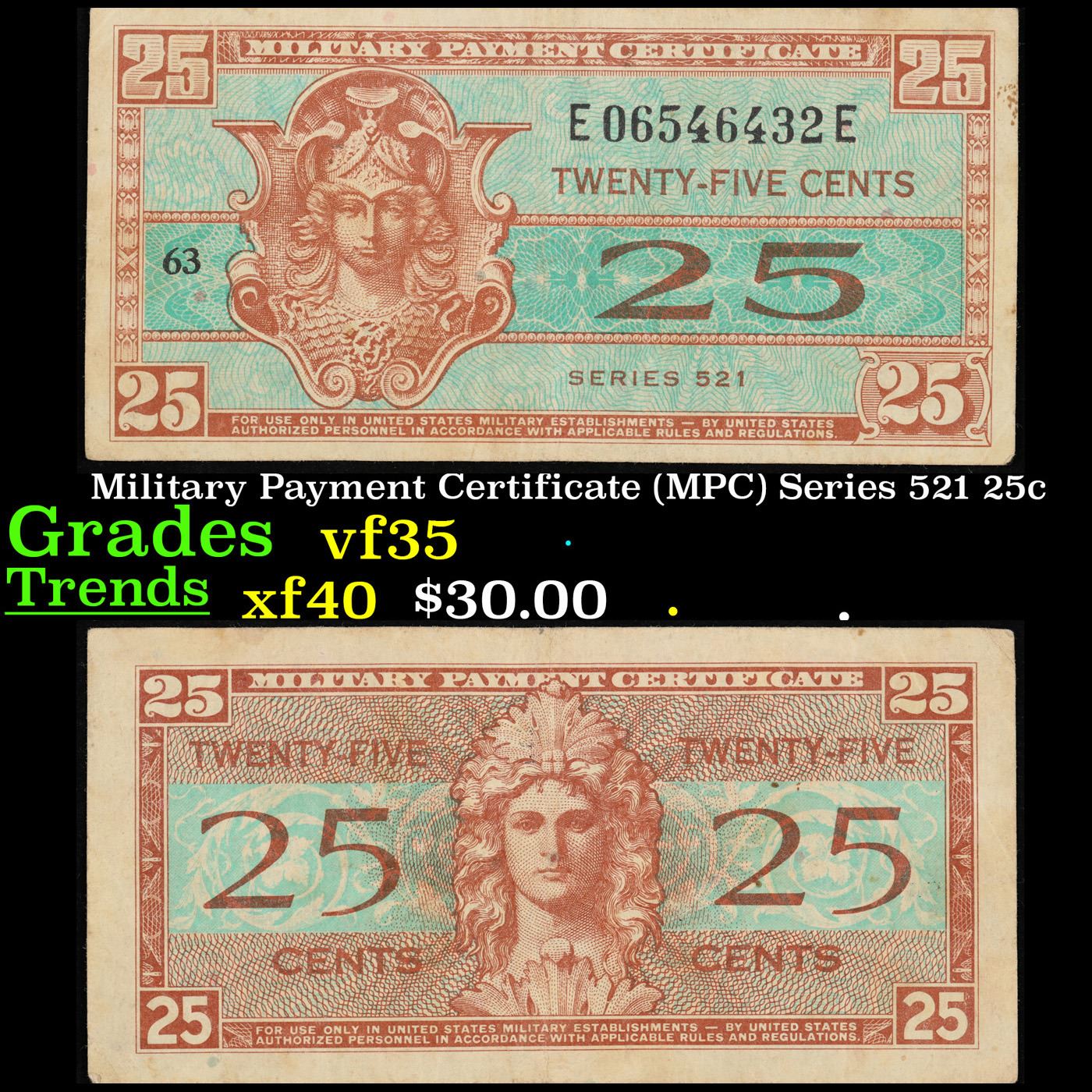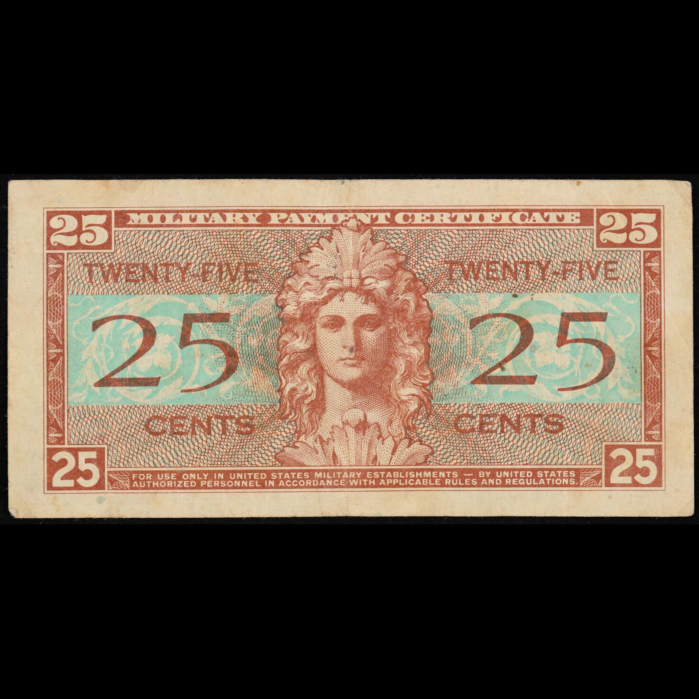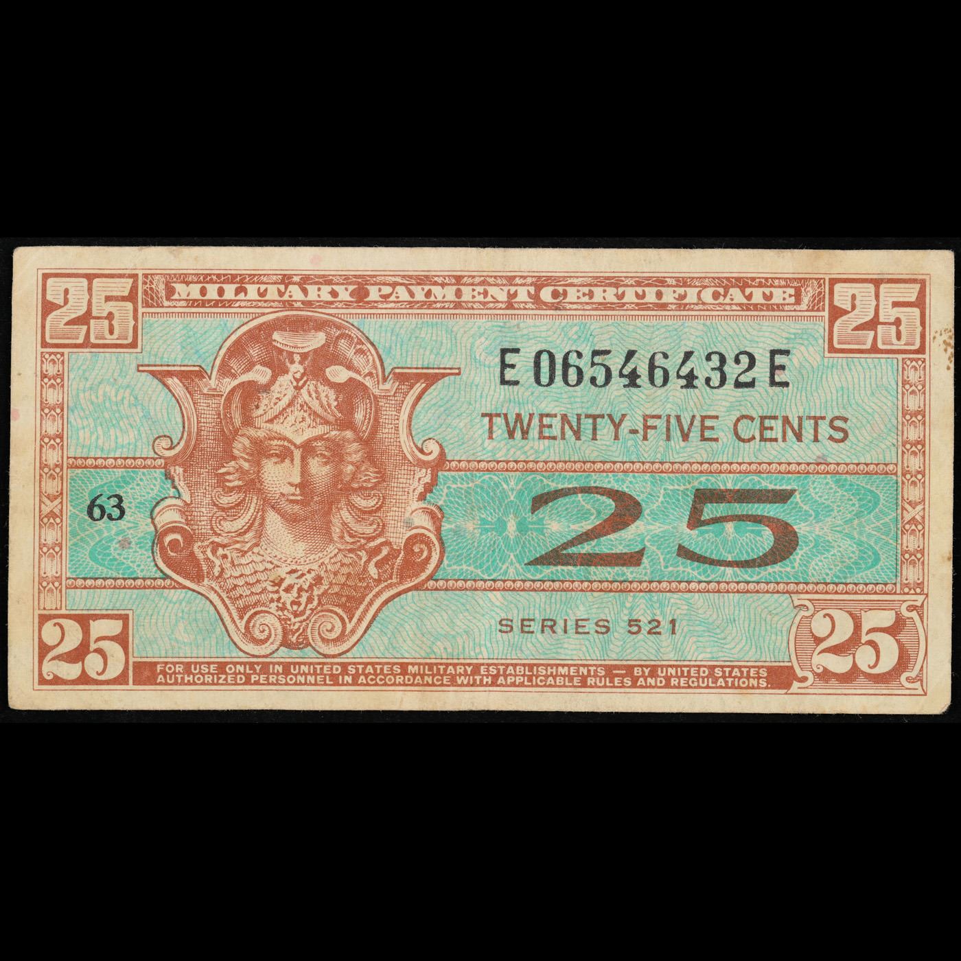 Military Payment Certificate (MPC) Series 521 25c Grades vf++. Military payment certificates, or MPC, were a form of currency used to pay U.S. military personnel in certain foreign countries. They were used in one area or another from a few months after the end of World War II until a few months after the end of U.S. participation in the Vietnam War – from 1946 until 1973. MPC utilized layers of line lithography to create colorful banknotes that could be produced cheaply. Fifteen series of MPCs were created. However, only 13 series were issued. The remaining two were largely destroyed, although some examples remain. Among the 13 released series a total of 94 notes are recognized.