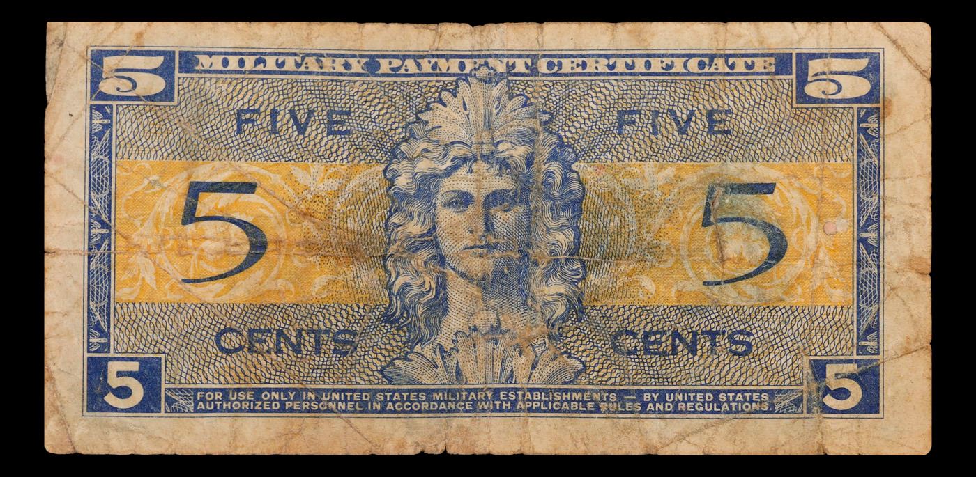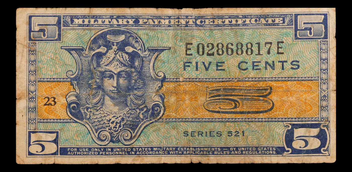 Military Payment Certificate (MPC) Series 521 5c Fr. M841 Grades f, fine. Military payment certificates, or MPC, were a form of currency used to pay U.S. military personnel in certain foreign countries. They were used in one area or another from a few months after the end of World War II until a few months after the end of U.S. participation in the Vietnam War Ð from 1946 until 1973. MPC utilized layers of line lithography to create colorful banknotes that could be produced cheaply. Fifteen series of MPCs were created. However, only 13 series were issued. The remaining two were largely destroyed, although some examples remain. Among the 13 released series a total of 94 notes are recognized.