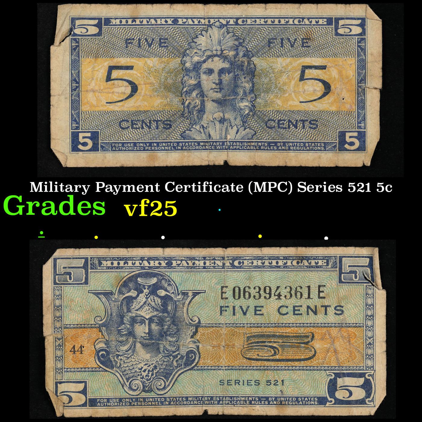 Military Payment Certificate (MPC) Series 521 5c Grades vf+. Military payment certificates, or MPC, were a form of currency used to pay U.S. military personnel in certain foreign countries. They were used in one area or another from a few months after the end of World War II until a few months after the end of U.S. participation in the Vietnam War – from 1946 until 1973. MPC utilized layers of line lithography to create colorful banknotes that could be produced cheaply. Fifteen series of MPCs were created. However, only 13 series were issued. The remaining two were largely destroyed, although some examples remain. Among the 13 released series a total of 94 notes are recognized.