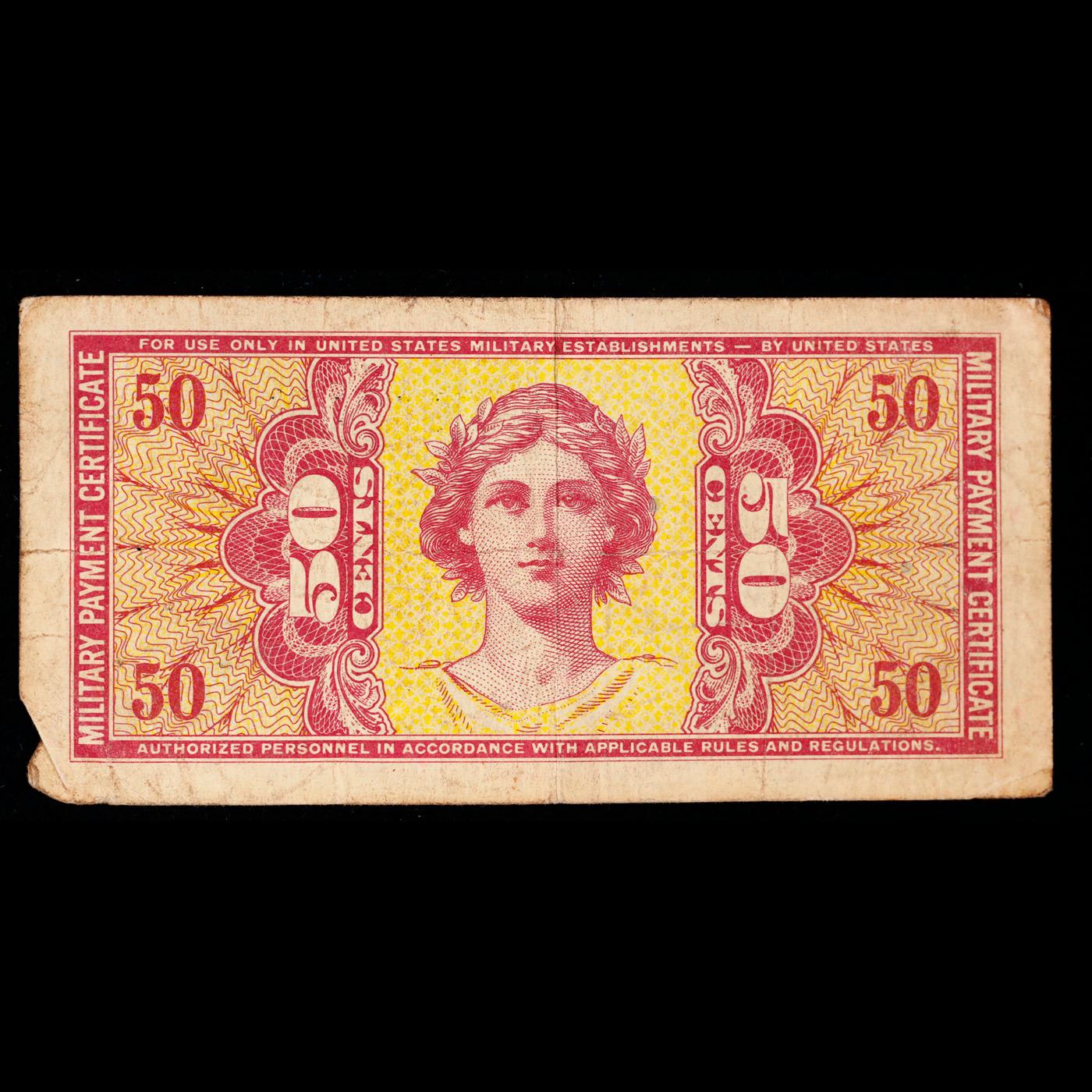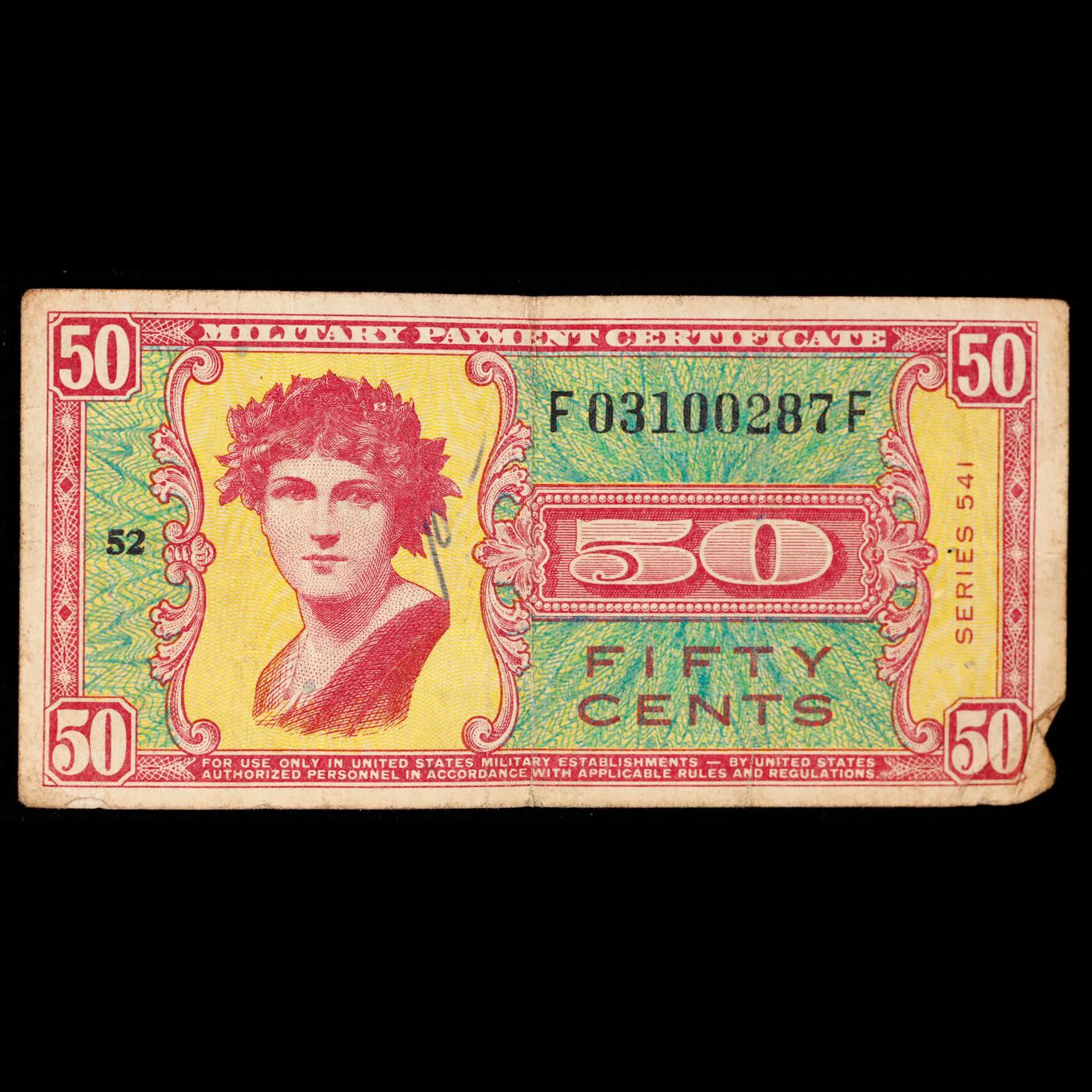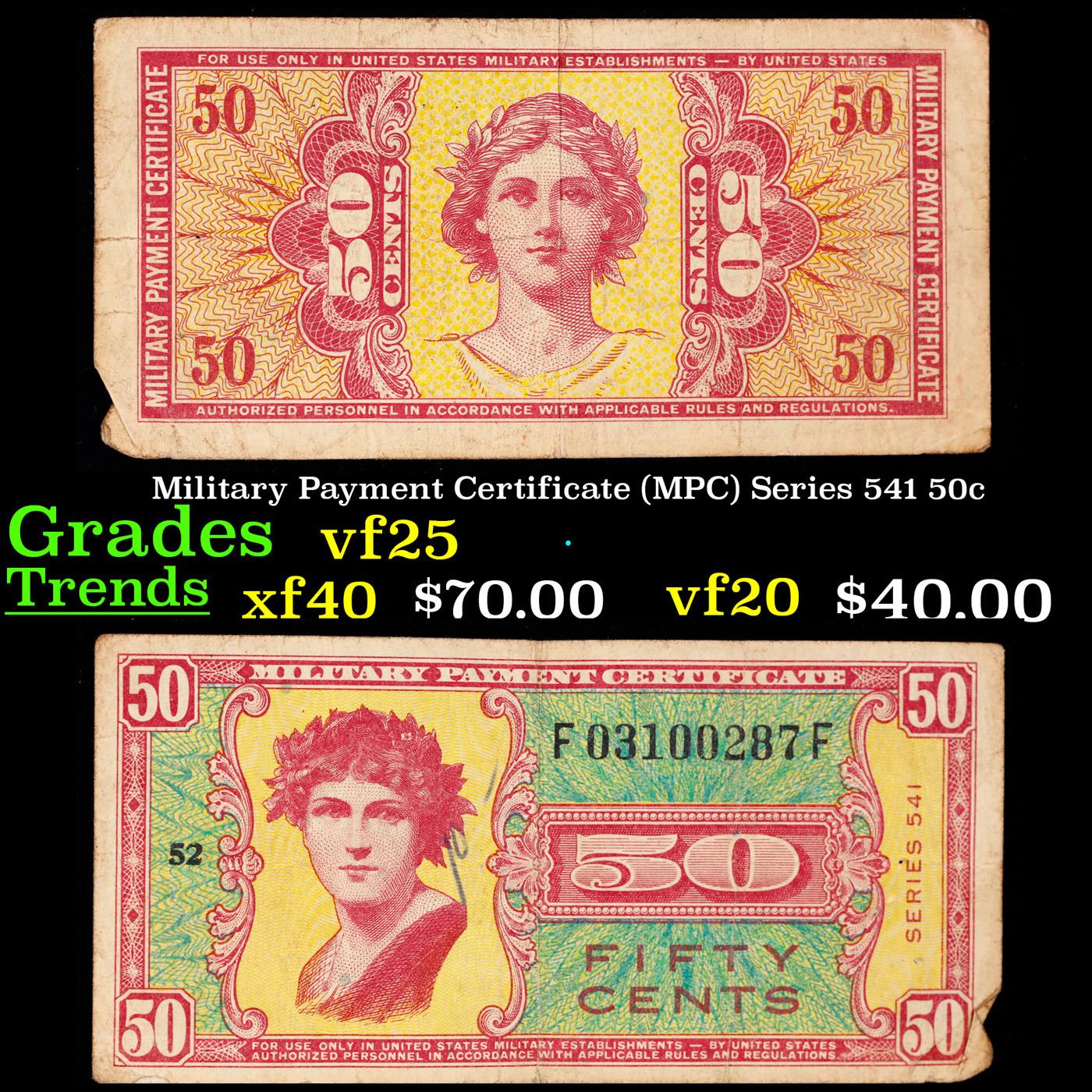 Military Payment Certificate (MPC) Series 541 50c Grades vf+. Series 541 military payment certificates are a lot of fun to collect. Collecting the entire series presents challenges in terms of rarity. There are also still unsolved mysteries when it comes to replacements and print ranges for series 541 notes. Like why are there some many high grade high serial numbered replacements out there? Replacement notes have a serial number that does not end with the letter F. Generally speaking, most replacements should command nice premiums. 541 MPCs were printed between May 27th, 1958 and May 26th, 1961. This was the last series printed by Tudor Press. Tudor botched record keeping and quality on this issue. Just like all prior issues, seven different denominations ranging from five cents to ten dollars were circulated in 14 different countries