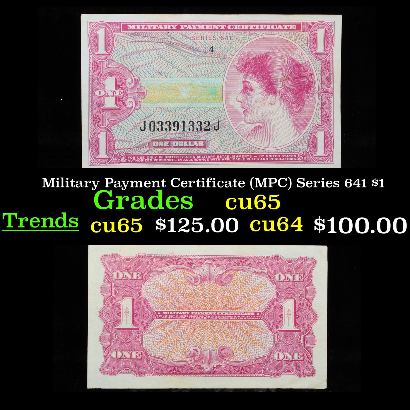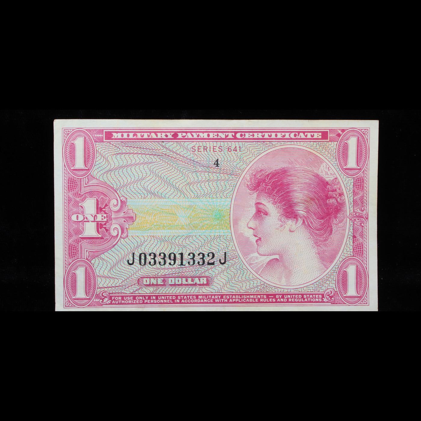 Military Payment Certificate (MPC) Series 641 $1 Grades Gem CU. Military payment certificates, or MPC, were a form of currency used to pay U.S. military personnel in certain foreign countries. They were used in one area or another from a few months after the end of World War II until a few months after the end of U.S. participation in the Vietnam War – from 1946 until 1973. MPC utilized layers of line lithography to create colorful banknotes that could be produced cheaply. Fifteen series of MPCs were created. However, only 13 series were issued. The remaining two were largely destroyed, although some examples remain. Among the 13 released series a total of 94 notes are recognized.