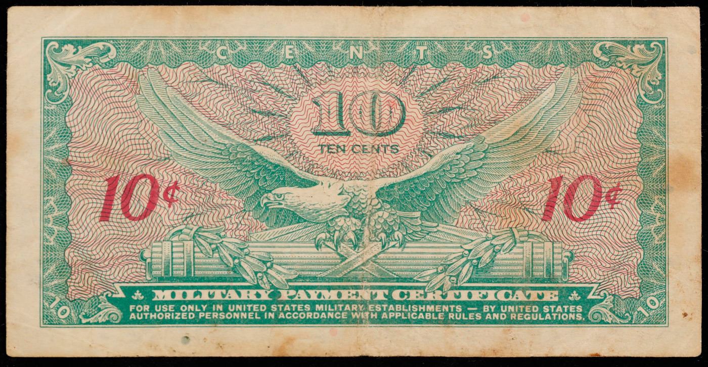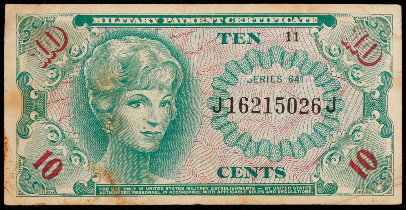 Military Payment Certificate (MPC) Series 641 10c Fr. M882 Grades Select AU. Military payment certificates, or MPC, were a form of currency used to pay U.S. military personnel in certain foreign countries. They were used in one area or another from a few months after the end of World War II until a few months after the end of U.S. participation in the Vietnam War – from 1946 until 1973. MPC utilized layers of line lithography to create colorful banknotes that could be produced cheaply. Fifteen series of MPCs were created. However, only 13 series were issued. The remaining two were largely destroyed, although some examples remain. Among the 13 released series a total of 94 notes are recognized.