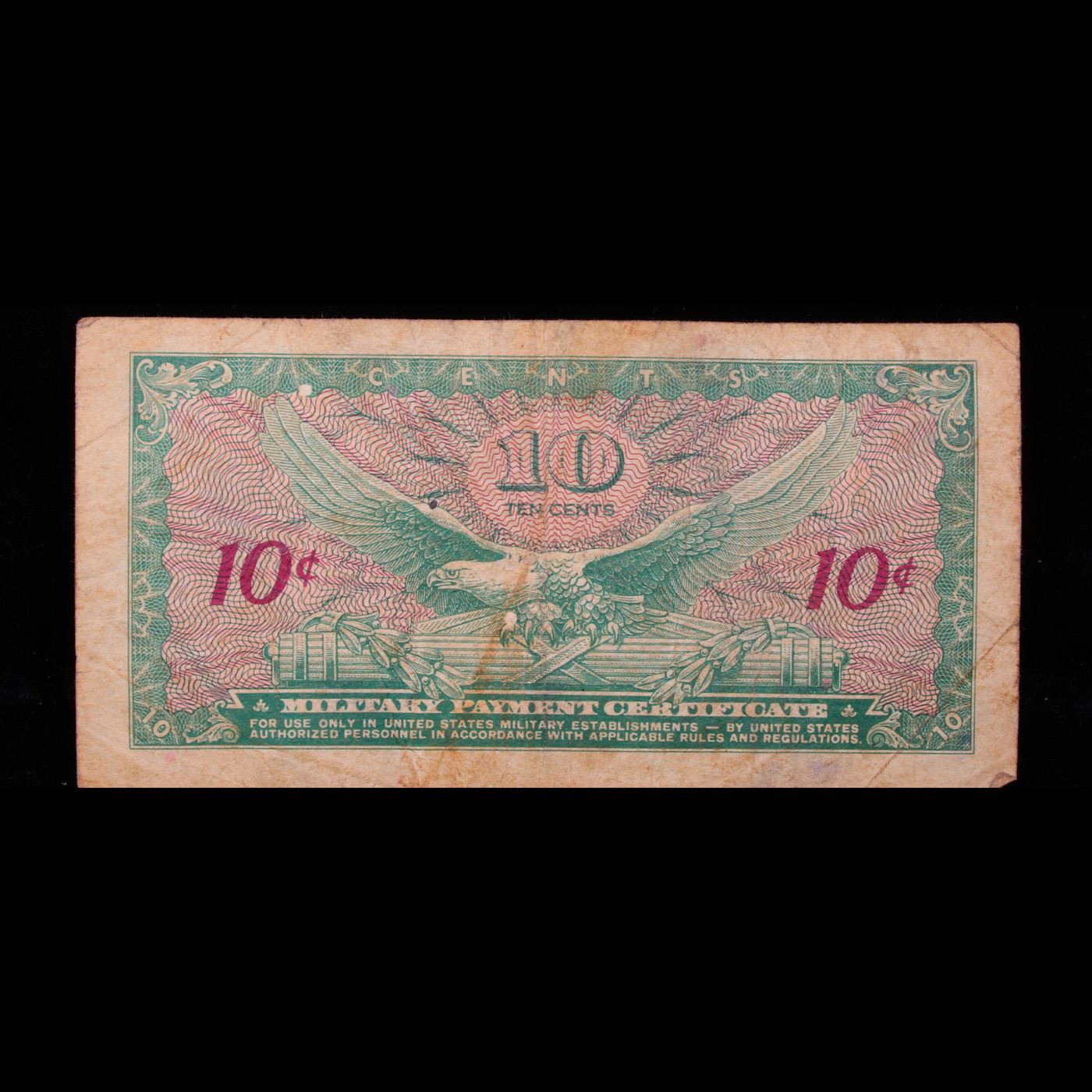 Military Payment Certificate (MPC) Series 641 10c Grades vf, very fine. Military payment certificates, or MPC, were a form of currency used to pay U.S. military personnel in certain foreign countries. They were used in one area or another from a few months after the end of World War II until a few months after the end of U.S. participation in the Vietnam War – from 1946 until 1973. MPC utilized layers of line lithography to create colorful banknotes that could be produced cheaply. Fifteen series of MPCs were created. However, only 13 series were issued. The remaining two were largely destroyed, although some examples remain. Among the 13 released series a total of 94 notes are recognized.