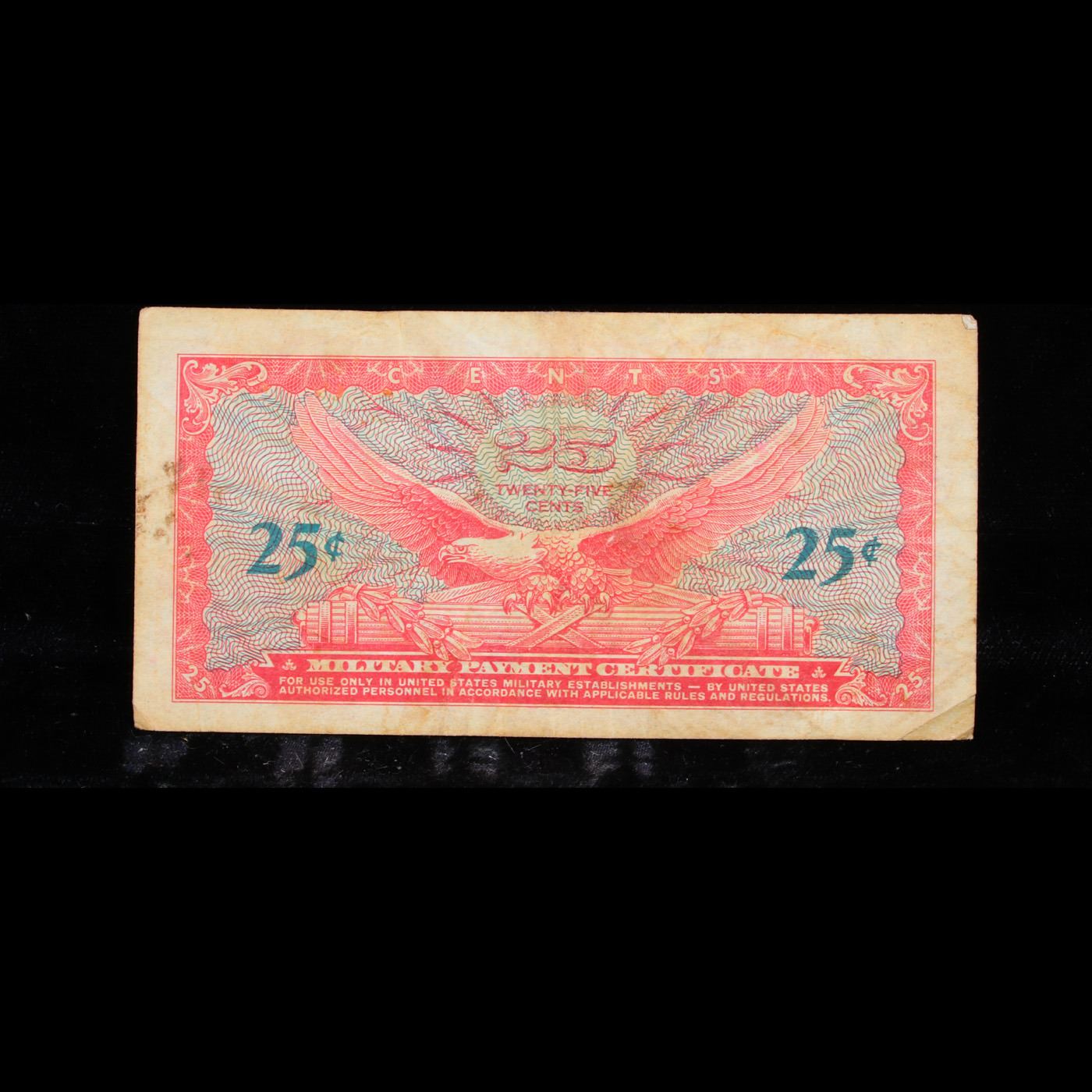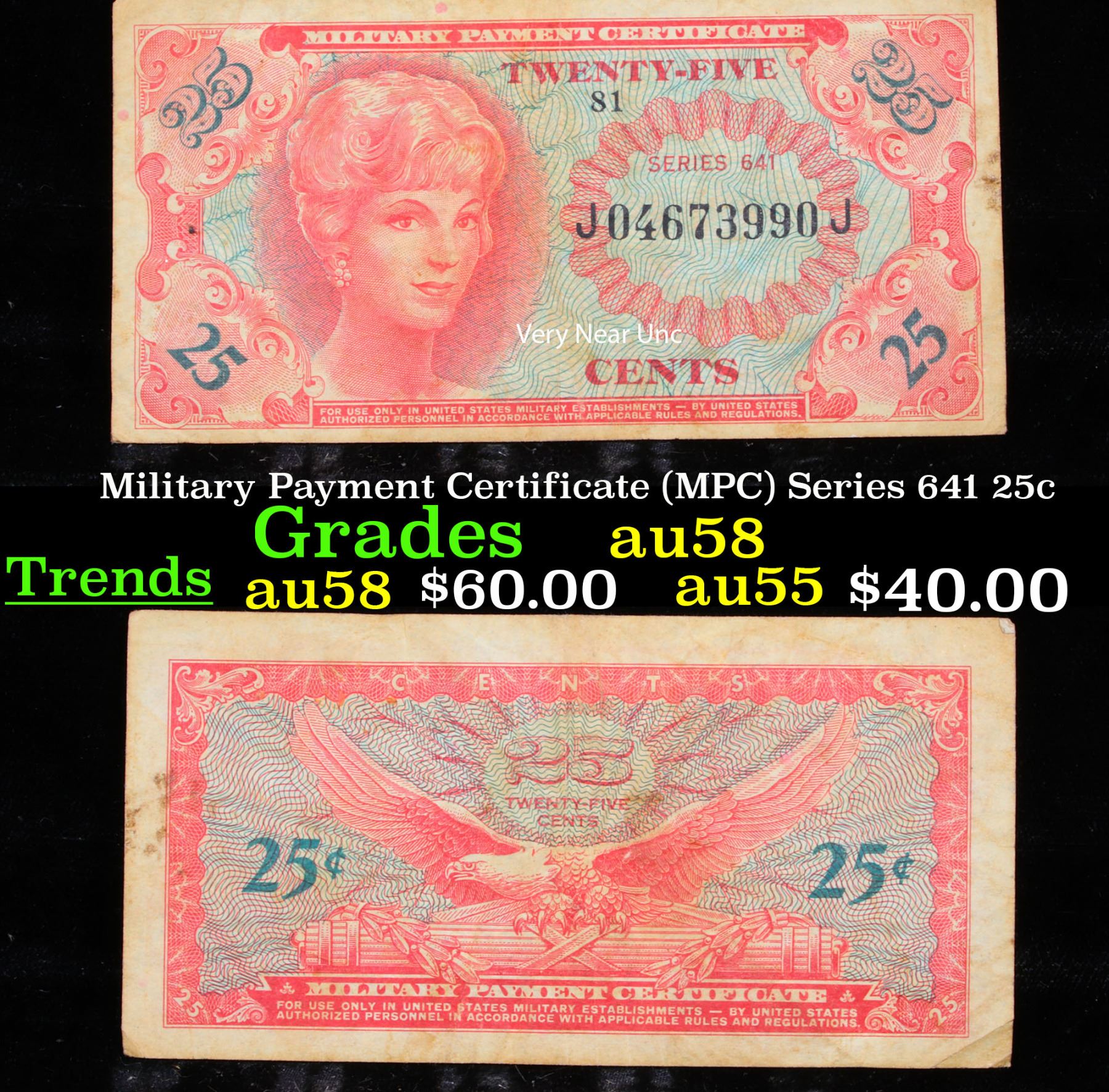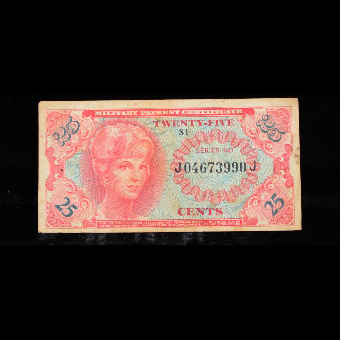 Military Payment Certificate (MPC) Series 641 25c Grades Choice AU/BU Slider. Military payment certificates, or MPC, were a form of currency used to pay U.S. military personnel in certain foreign countries. They were used in one area or another from a few months after the end of World War II until a few months after the end of U.S. participation in the Vietnam War – from 1946 until 1973. MPC utilized layers of line lithography to create colorful banknotes that could be produced cheaply. Fifteen series of MPCs were created. However, only 13 series were issued. The remaining two were largely destroyed, although some examples remain. Among the 13 released series a total of 94 notes are recognized.