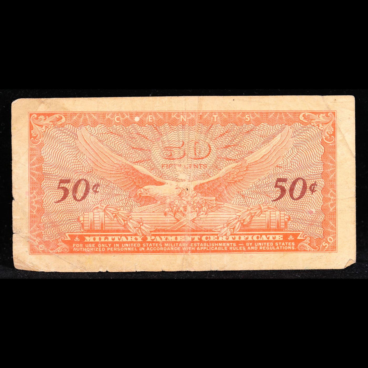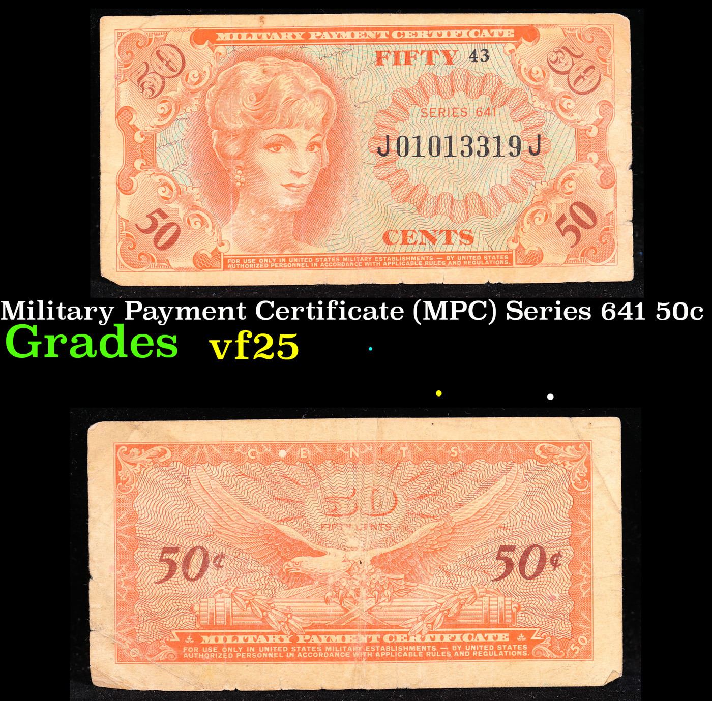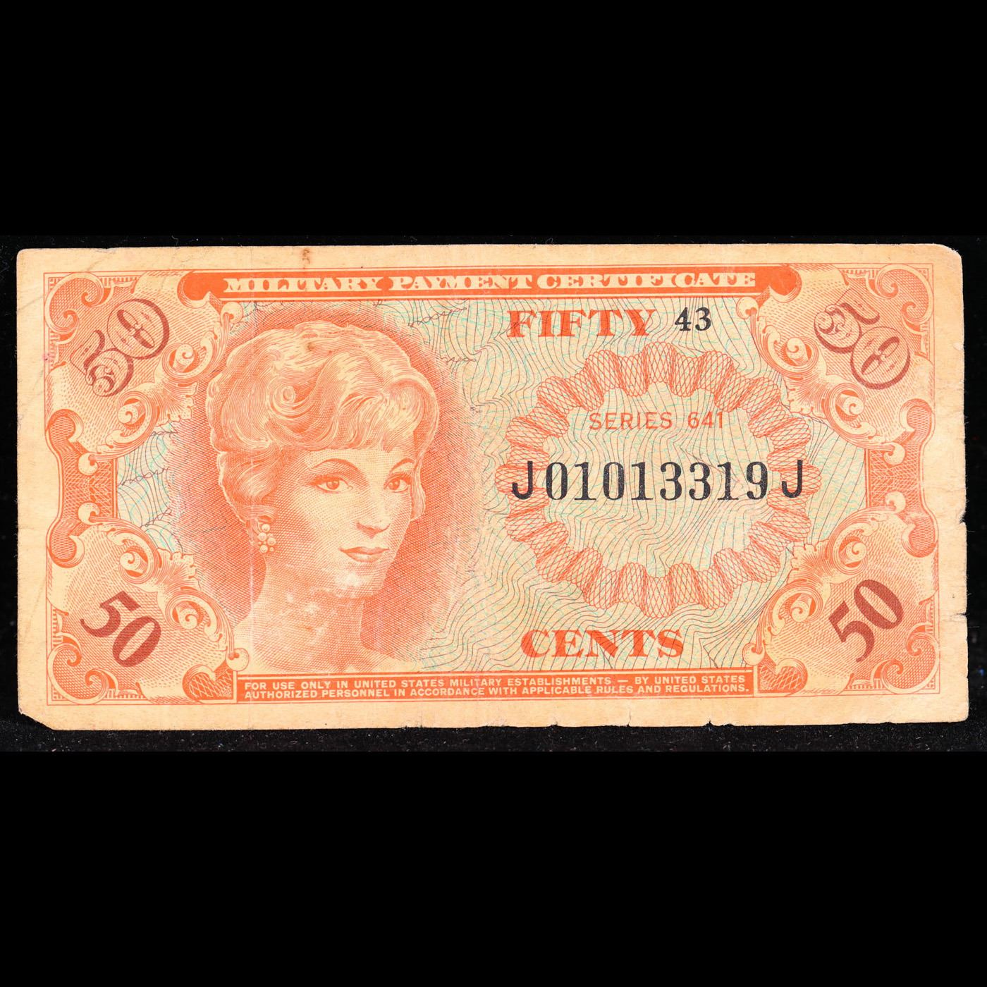 Military Payment Certificate (MPC) Series 641 50c Grades vf+. Military payment certificates, or MPC, were a form of currency used to pay U.S. military personnel in certain foreign countries. They were used in one area or another from a few months after the end of World War II until a few months after the end of U.S. participation in the Vietnam War – from 1946 until 1973. MPC utilized layers of line lithography to create colorful banknotes that could be produced cheaply. Fifteen series of MPCs were created. However, only 13 series were issued. The remaining two were largely destroyed, although some examples remain. Among the 13 released series a total of 94 notes are recognized.