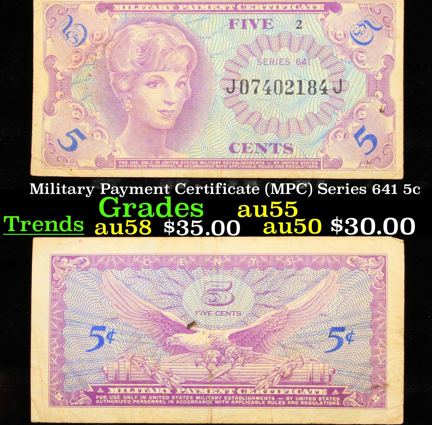 Military Payment Certificate (MPC) Series 641 5c Choice AU. Military payment certificates, or MPC, were a form of currency used to pay U.S. military personnel in certain foreign countries. They were used in one area or another from a few months after the end of World War II until a few months after the end of U.S. participation in the Vietnam War – from 1946 until 1973. MPC utilized layers of line lithography to create colorful banknotes that could be produced cheaply. Fifteen series of MPCs were created. However, only 13 series were issued. The remaining two were largely destroyed, although some examples remain. Among the 13 released series a total of 94 notes are recognized.