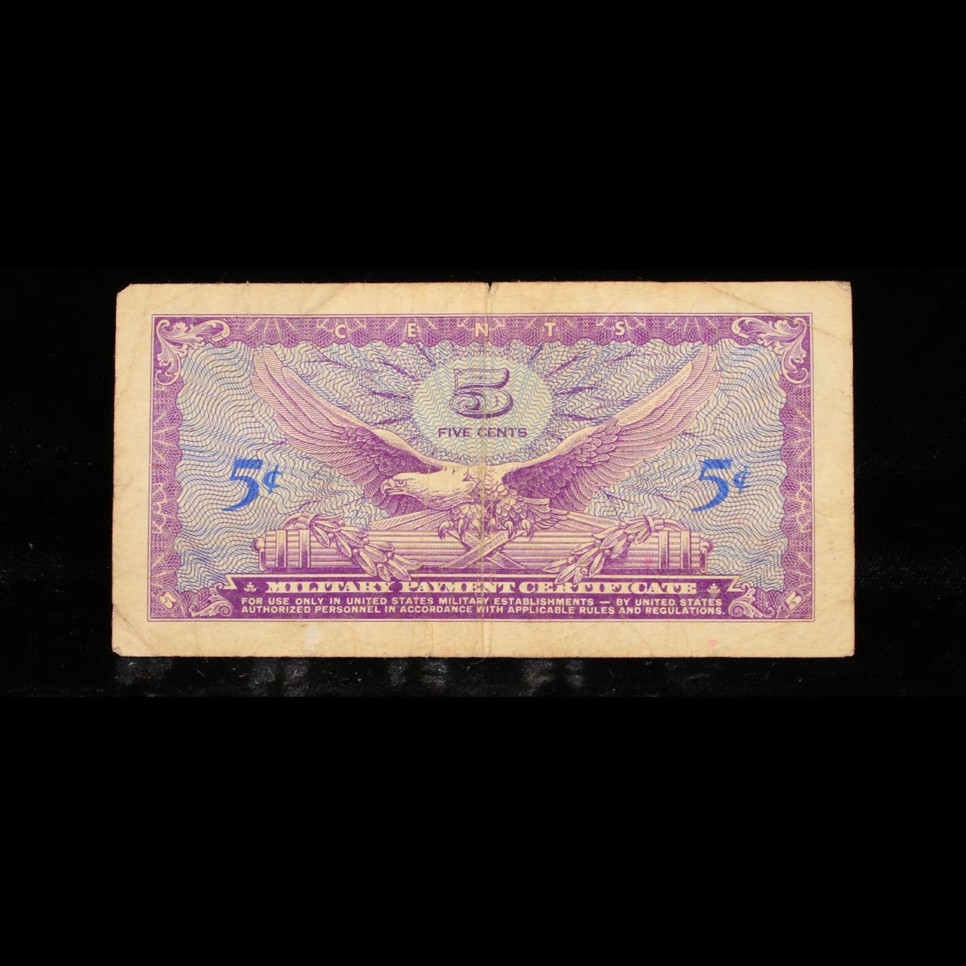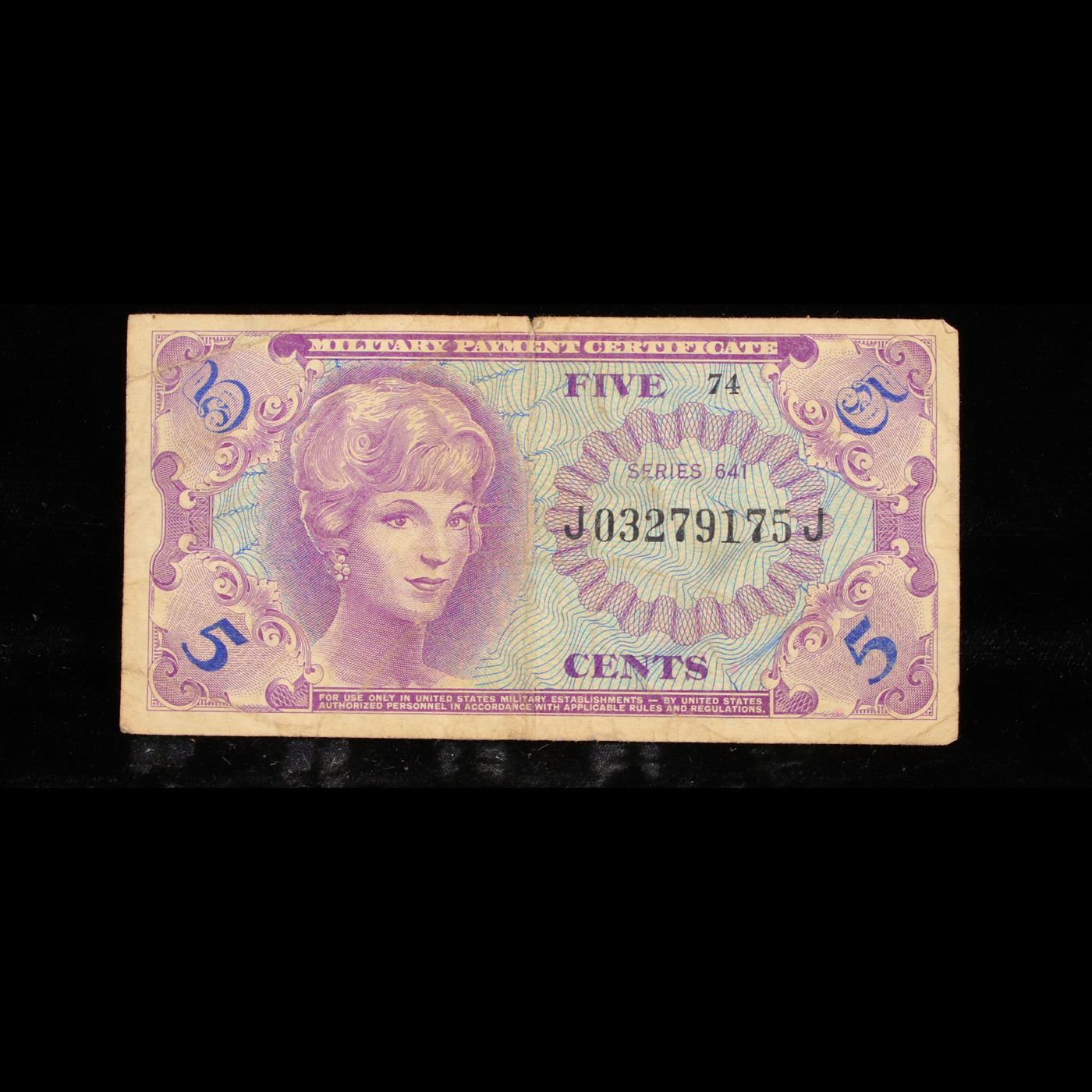 Military Payment Certificate (MPC) Series 641 5c Grades AU, Almost Unc. Military payment certificates, or MPC, were a form of currency used to pay U.S. military personnel in certain foreign countries. They were used in one area or another from a few months after the end of World War II until a few months after the end of U.S. participation in the Vietnam War – from 1946 until 1973. MPC utilized layers of line lithography to create colorful banknotes that could be produced cheaply. Fifteen series of MPCs were created. However, only 13 series were issued. The remaining two were largely destroyed, although some examples remain. Among the 13 released series a total of 94 notes are recognized.
