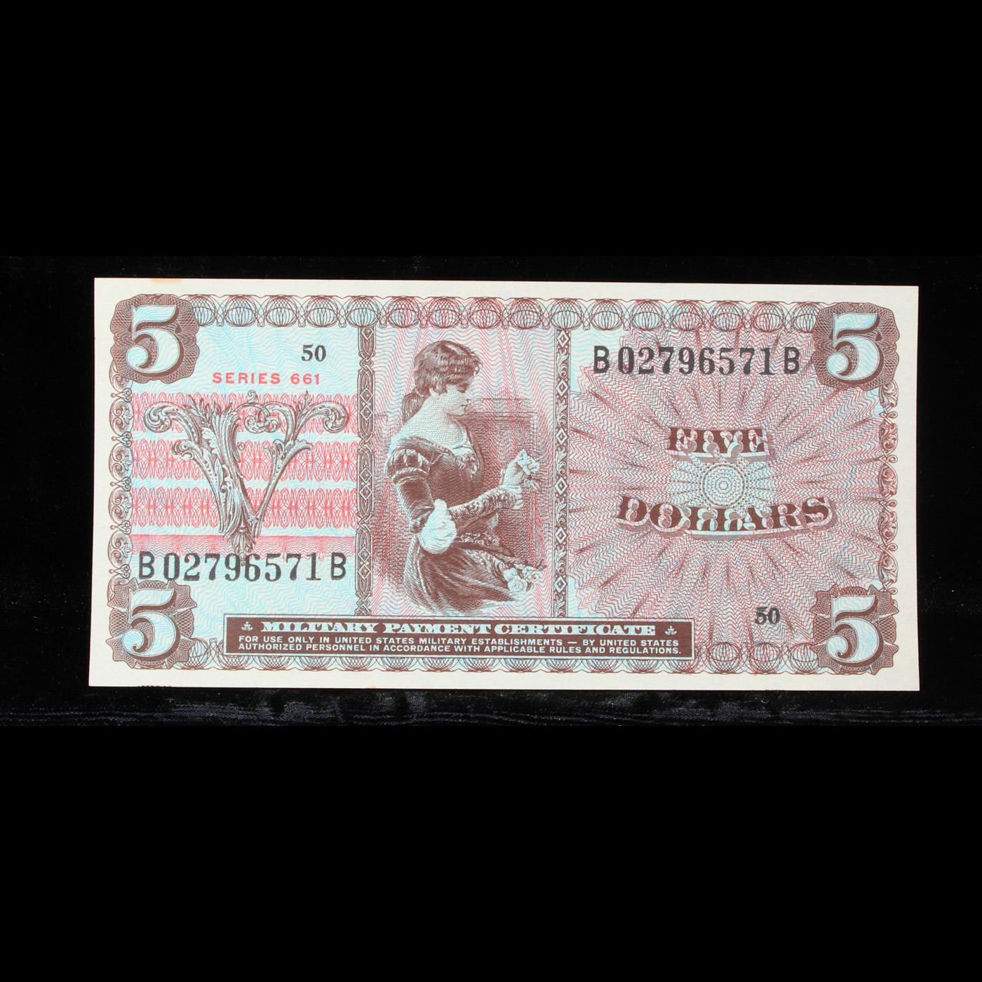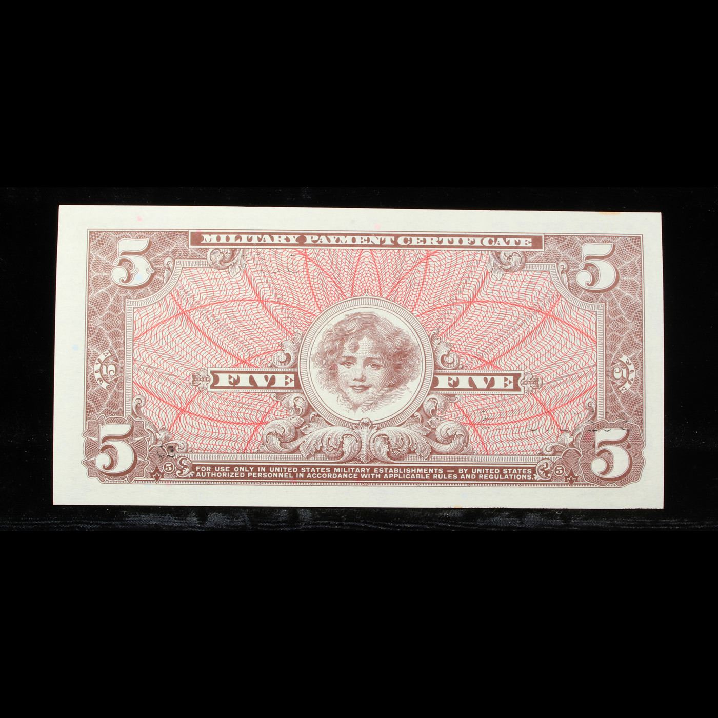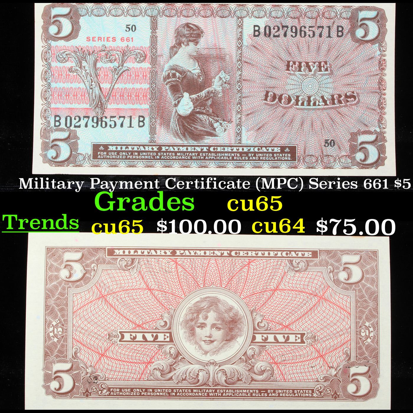 Military Payment Certificate (MPC) Series 661 $5 Grades Gem CU. Military payment certificates, or MPC, were a form of currency used to pay U.S. military personnel in certain foreign countries. They were used in one area or another from a few months after the end of World War II until a few months after the end of U.S. participation in the Vietnam War – from 1946 until 1973. MPC utilized layers of line lithography to create colorful banknotes that could be produced cheaply. Fifteen series of MPCs were created. However, only 13 series were issued. The remaining two were largely destroyed, although some examples remain. Among the 13 released series a total of 94 notes are recognized.