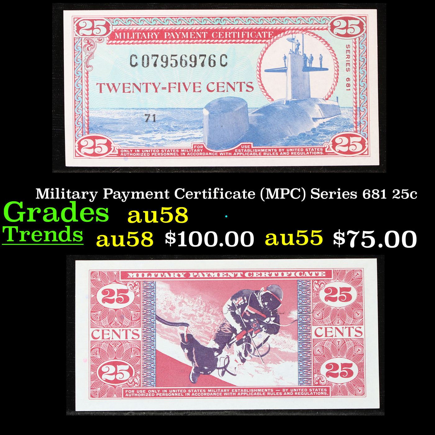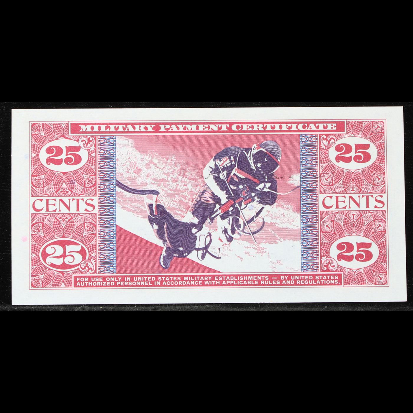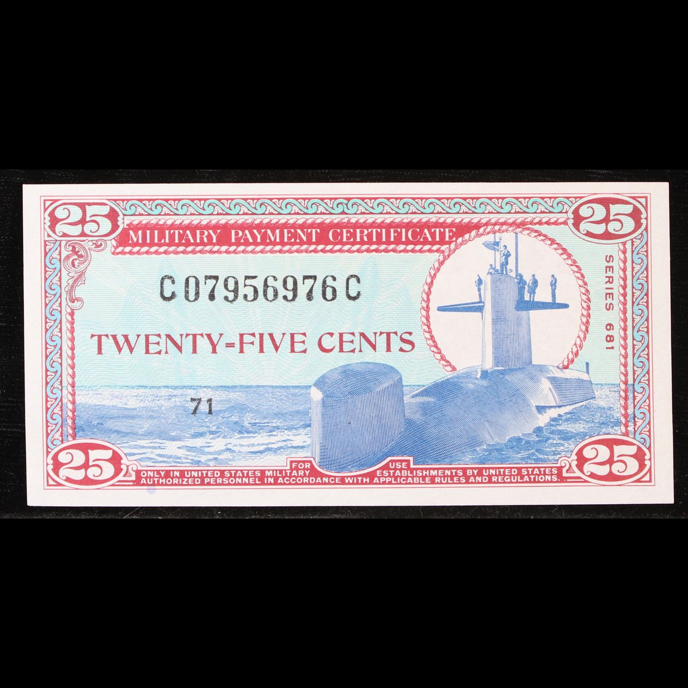 Military Payment Certificate (MPC) Series 681 25c Grades Choice AU/BU Slider. Military payment certificates, or MPC, were a form of currency used to pay U.S. military personnel in certain foreign countries. They were used in one area or another from a few months after the end of World War II until a few months after the end of U.S. participation in the Vietnam War – from 1946 until 1973. MPC utilized layers of line lithography to create colorful banknotes that could be produced cheaply. Fifteen series of MPCs were created. However, only 13 series were issued. The remaining two were largely destroyed, although some examples remain. Among the 13 released series a total of 94 notes are recognized.