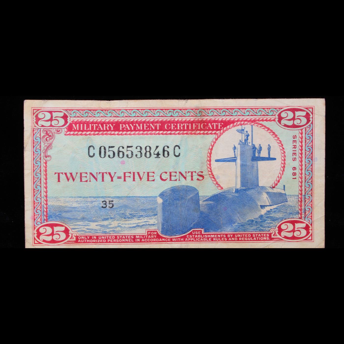 Military Payment Certificate (MPC) Series 681 25c Grades Select AU. Military payment certificates, or MPC, were a form of currency used to pay U.S. military personnel in certain foreign countries. They were used in one area or another from a few months after the end of World War II until a few months after the end of U.S. participation in the Vietnam War – from 1946 until 1973. MPC utilized layers of line lithography to create colorful banknotes that could be produced cheaply. Fifteen series of MPCs were created. However, only 13 series were issued. The remaining two were largely destroyed, although some examples remain. Among the 13 released series a total of 94 notes are recognized.