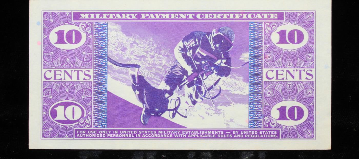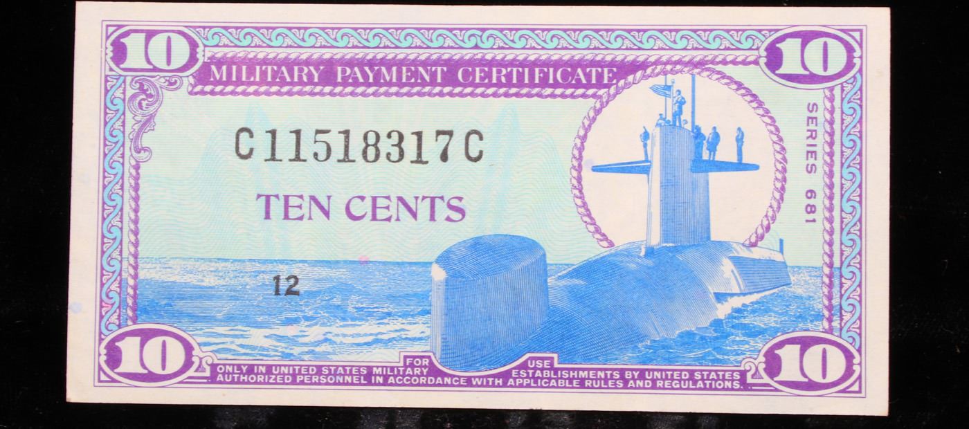 Military Payment Certificate (MPC) Series 691 10c Gem CU. Military payment certificates, or MPC, were a form of currency used to pay U.S. military personnel in certain foreign countries. They were used in one area or another from a few months after the end of World War II until a few months after the end of U.S. participation in the Vietnam War – from 1946 until 1973. MPC utilized layers of line lithography to create colorful banknotes that could be produced cheaply. Fifteen series of MPCs were created. However, only 13 series were issued. The remaining two were largely destroyed, although some examples remain. Among the 13 released series a total of 94 notes are recognized.