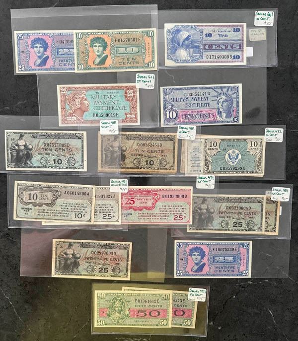 Military Payment Certificates, 1946-73, a group of 102. Issued under the authority of the Dept. of War, then the Department of Defense for use by the US Military, not redeemable for US currency since 1973; Fifteen Series were created but only 13 were issued this group includes Series 461, 471, 472, 481, 521, 541, 541, 591, 611, 641, 661, 681, and 692 in varying denominations from 5¢ - $20. High value items of note are Series 521 50¢; Series 681 $5 (x3), $10 and $20; Series 692 $10 and $20. Some would well benefit from certificates to confirm our grades as many of the high values are in pristine uncirculated condition, of course there are plenty that are well worn. This is an interesting area and one that could be fun to complete - this lot would give you a great start! A complete inventory is included with notes on our estimated values