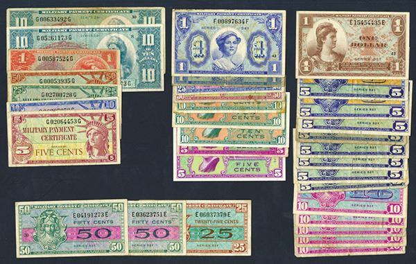United States Military Payment Certificates. Series 521. 5c (8), 10c (5), 25c, 50c (2), $1. Series 541 5c (2), 10c (3 one with tape), 25c, 50c, $1 (2). Series 591. 5c, 10c, 25c, 50c, $1. $10 (2). Generally Very Good-Fine. Some with other issues. 33 pieces.