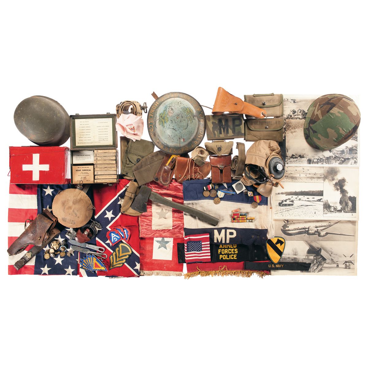 This lot includes webbed belts, leather slings, leggings, pouches, backpacks, a hatchet, military rank and division patches, ribbons and pins, an American and Confederate flag, 7 Viet Nam/WWII era American helmets and 1 WWI helmet with a painted scene and gold "CO. D. 536TH ENGRS. FRANCE. 1919. A. E.F. SGT. GEO.W. HOWELL." around the rim.