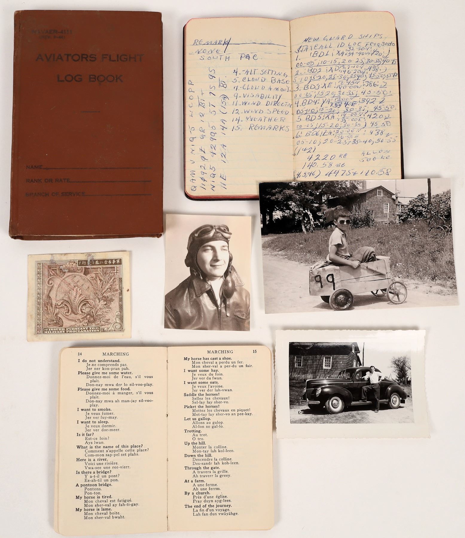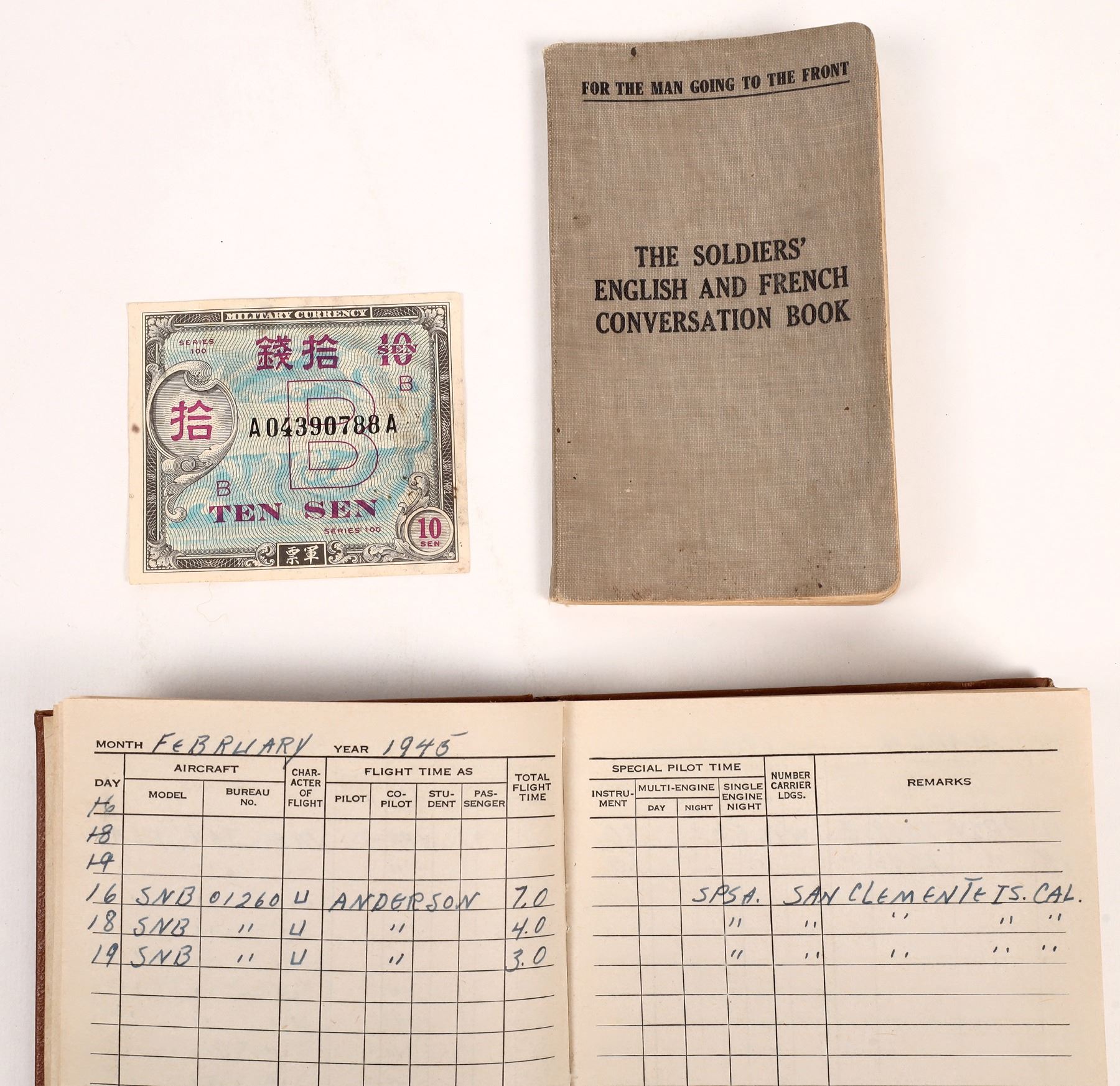 3 small military related books. The Soldiers' English and French Conversation Book. Leather USNR patch and hand written radioman notes. Aviators Flight Log Book 1944. 10 Sen military currency.