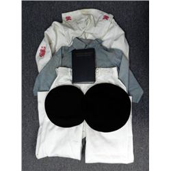 WWII U.S. MERCHANT SEAMAN GROUPING-UNIFORM -MANUAL HATS+---WWII U.S. MERCHANT SEAMAN WHITE SUMMER UNIFORM WITH INSIGNIA--(BOTH JUMPER & PANTS--BLU