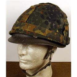 OFFERED HERE IS A POST-WWII, WEST GERMAN COMBAT HELMET WITH FULL LINER & CHINSTRAP. IT HAS A GREAT CAMOUFLAGE COVER WITH GERMAN INSTRUCTIONS PAST