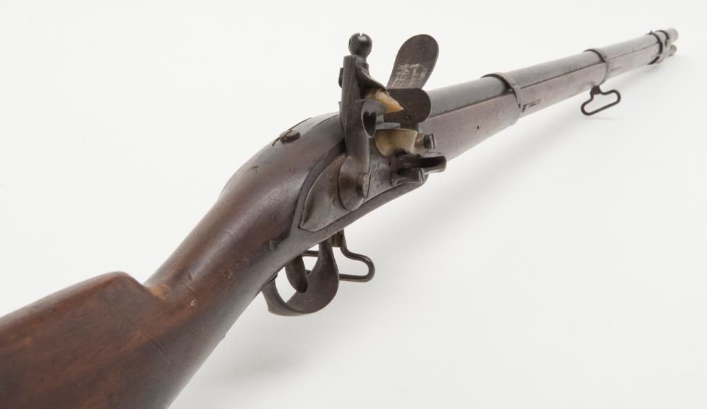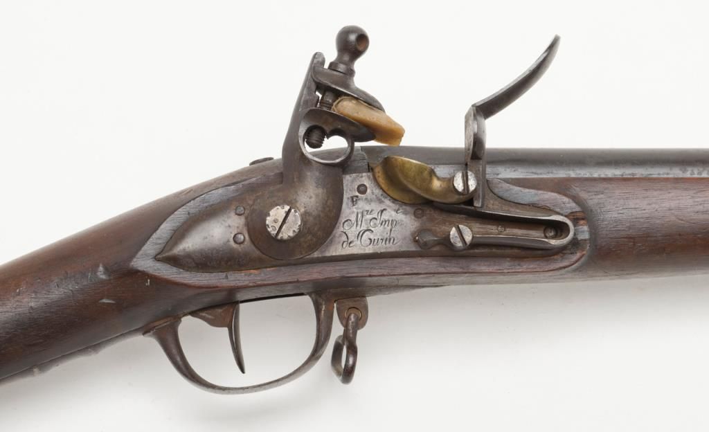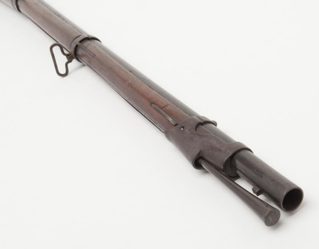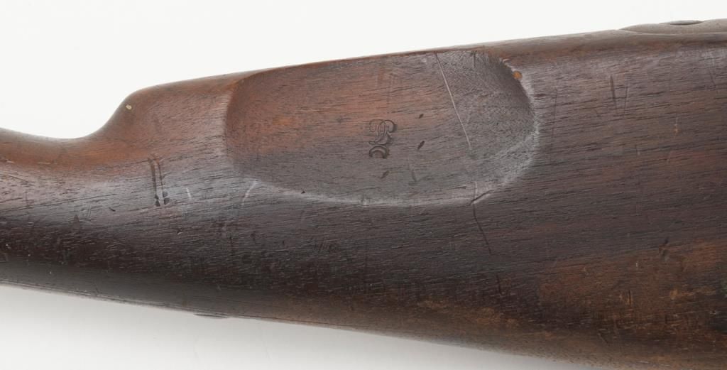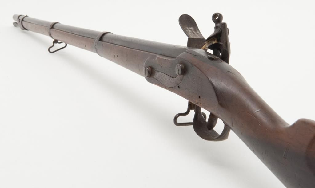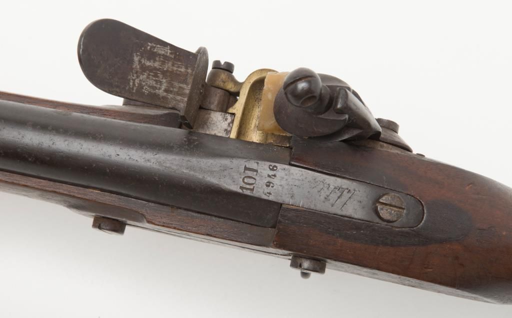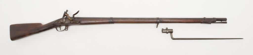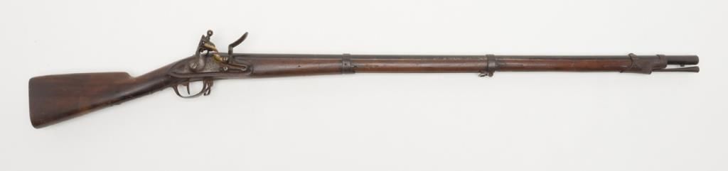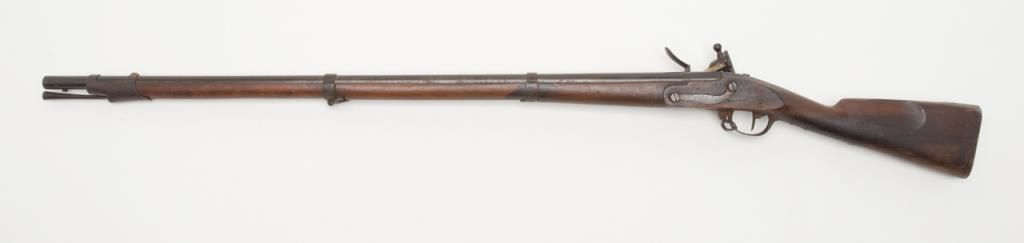 Military issue flintlock musket with Turin arsenal markings in .69 caliber remaining in original very good condition. Bayonet ramrod included. Stock is very good plus with only a few minor dings, mars, small losses and minor aging. Themetal surfaces show considerable original darkened brown and patina finish. Some minor erosion and pinprick pitting. Serial numbered 4946 at the breech. Regimental marking 10 L in this area also. A very nice and completely original flintlockmusket showing French style probably during era when Napoleon placed his brother on the throne of Italy. Est.: $750-$1500