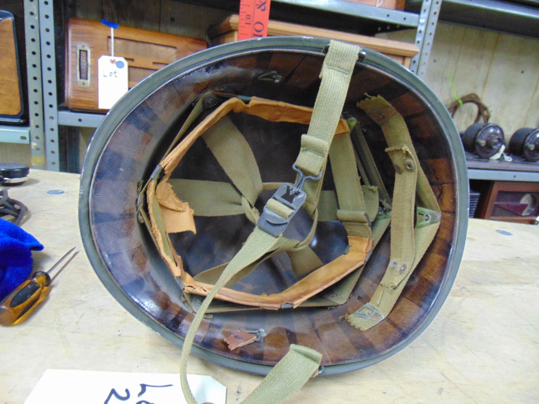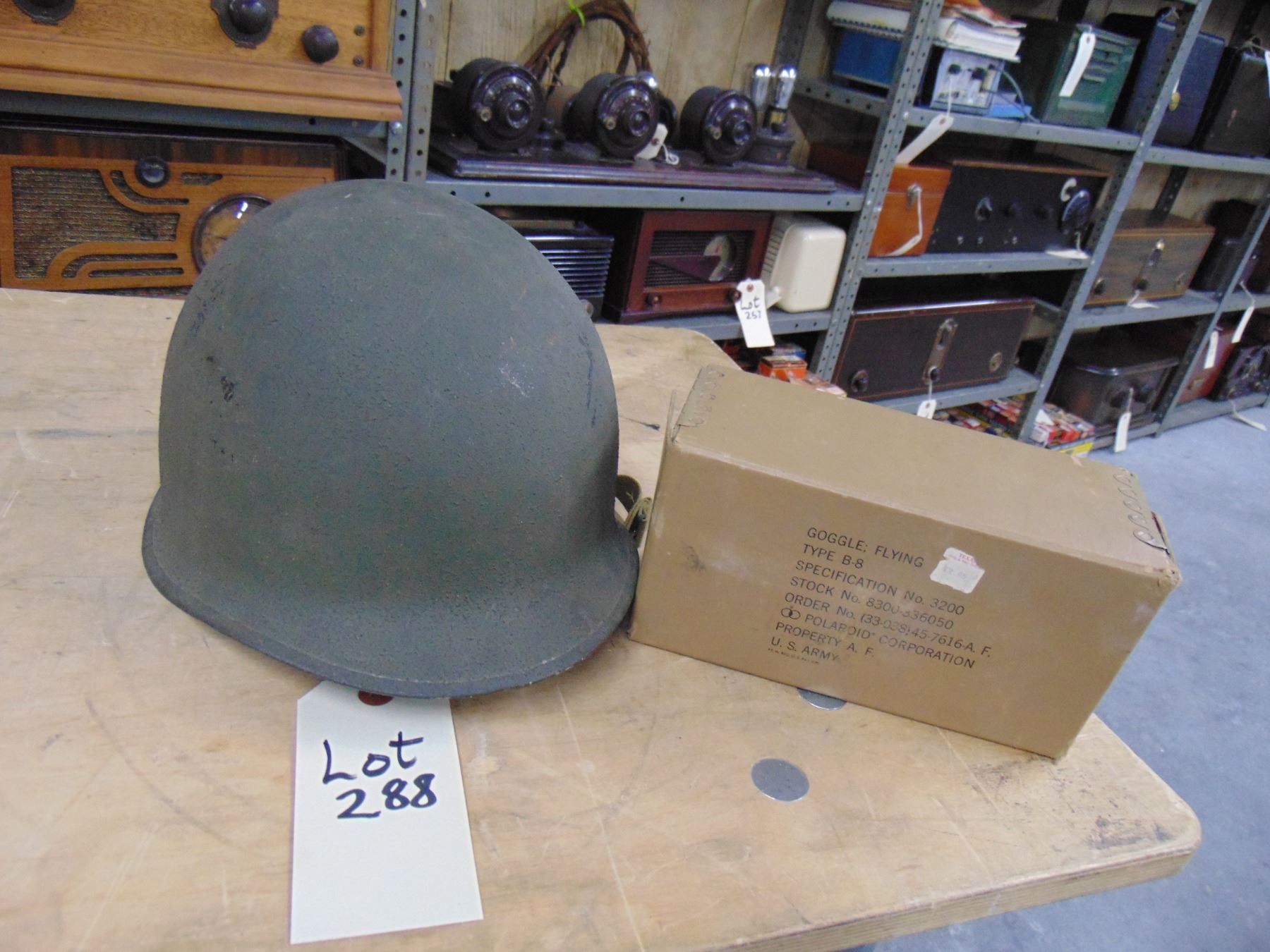 2 items; Soldier helmet and empty military goggle box with literature