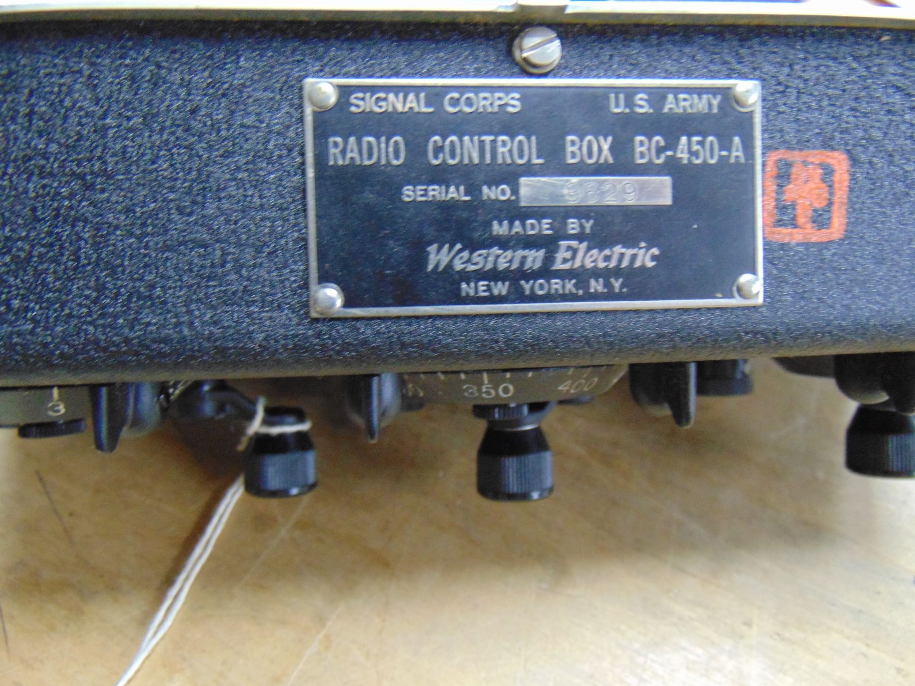 2 items; Signal Corps radio control box, model BC-450-A, made by Western Electric; military navigation equipment, model R-443/ARN5D; works with ARN-14