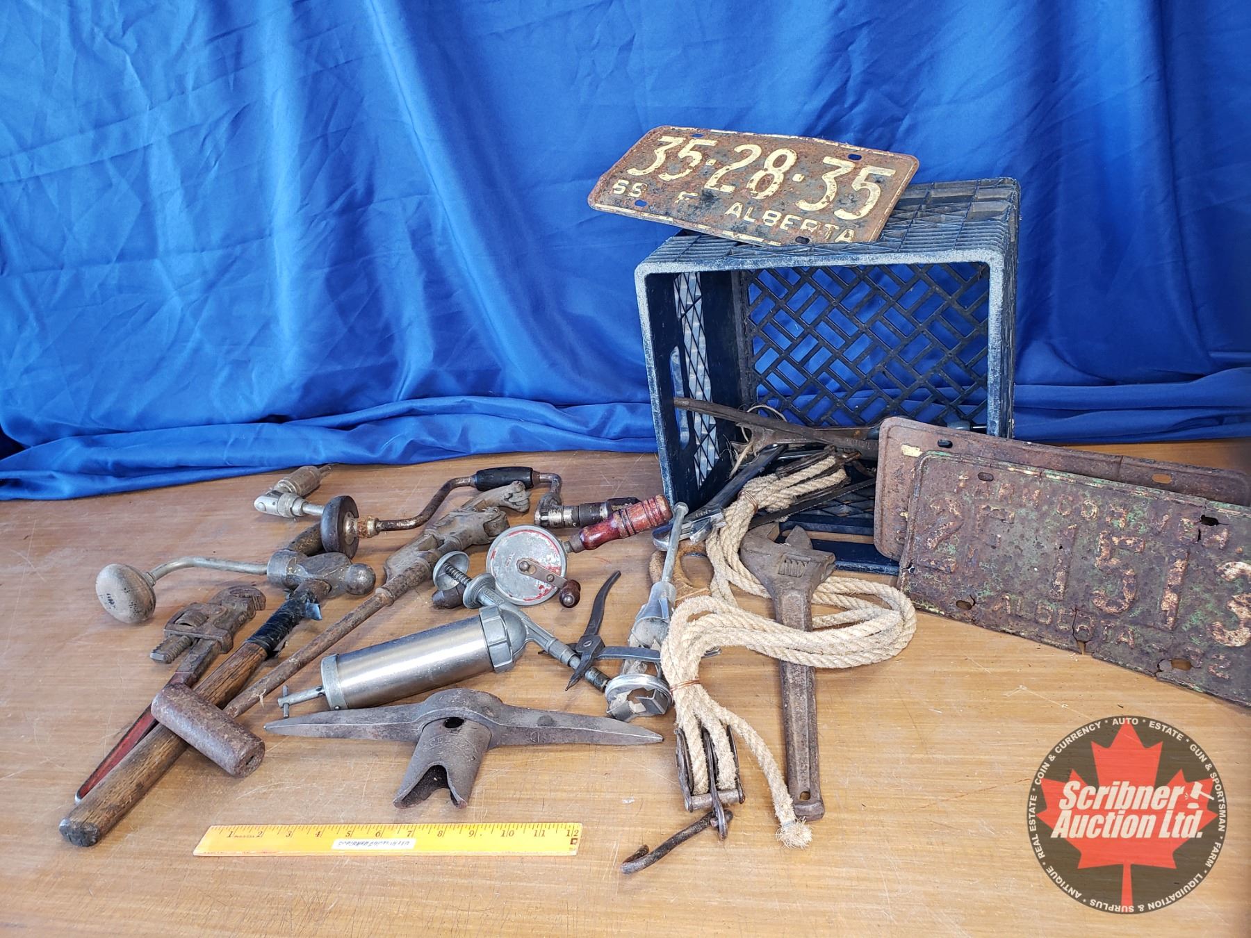 Milk Crate Lot: Prospector Pick, Pipe Wrench, Hammer, Brace, Mini Block & Tackle, etc