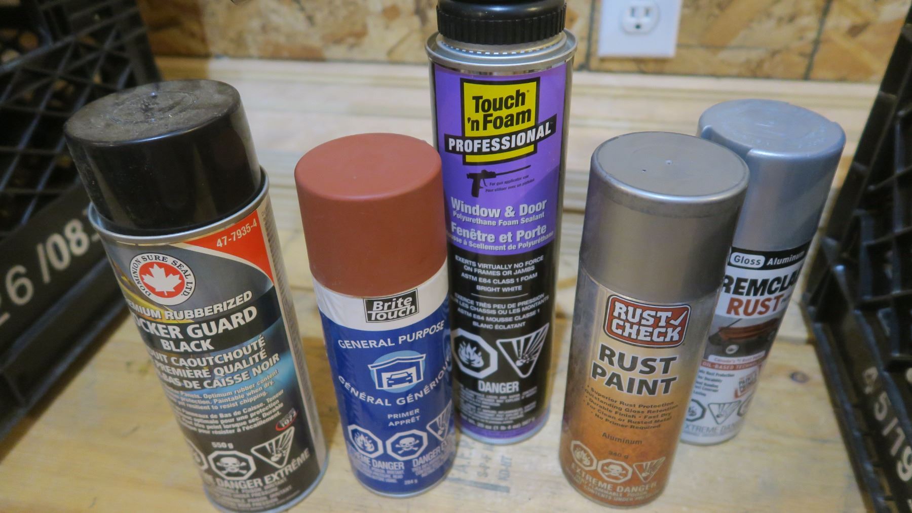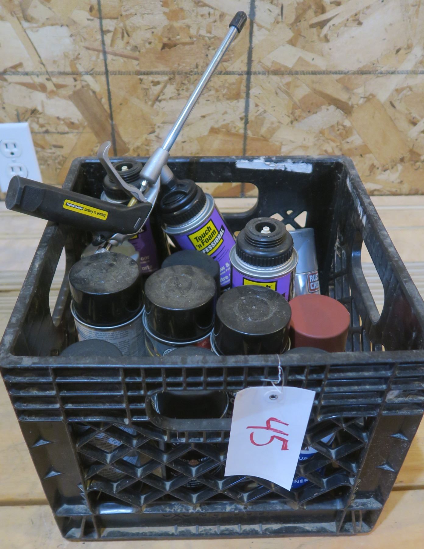Milk Crate of Assorted Liquids, Door Sealant, Rocker Guard, Primer, Etc.