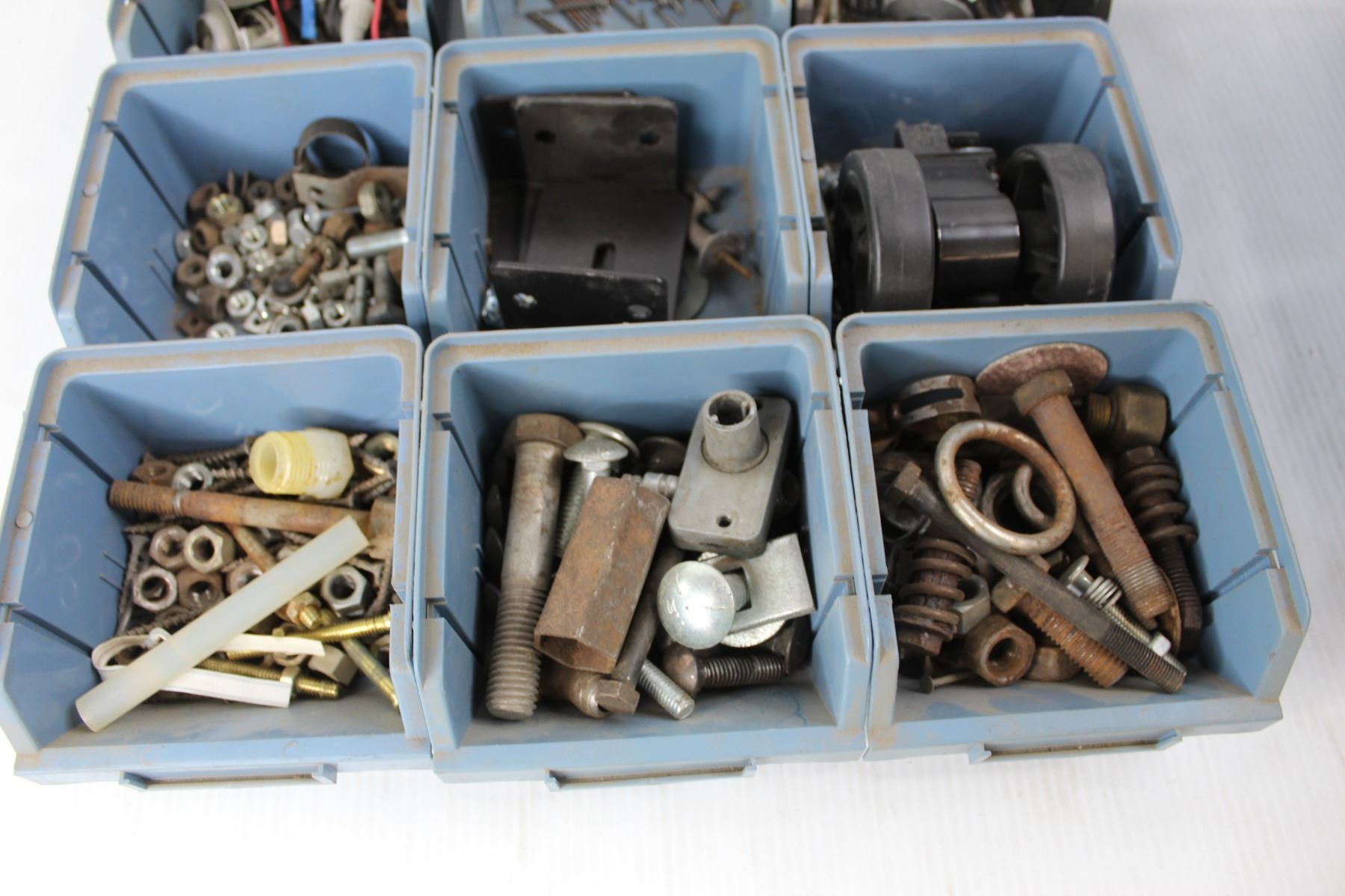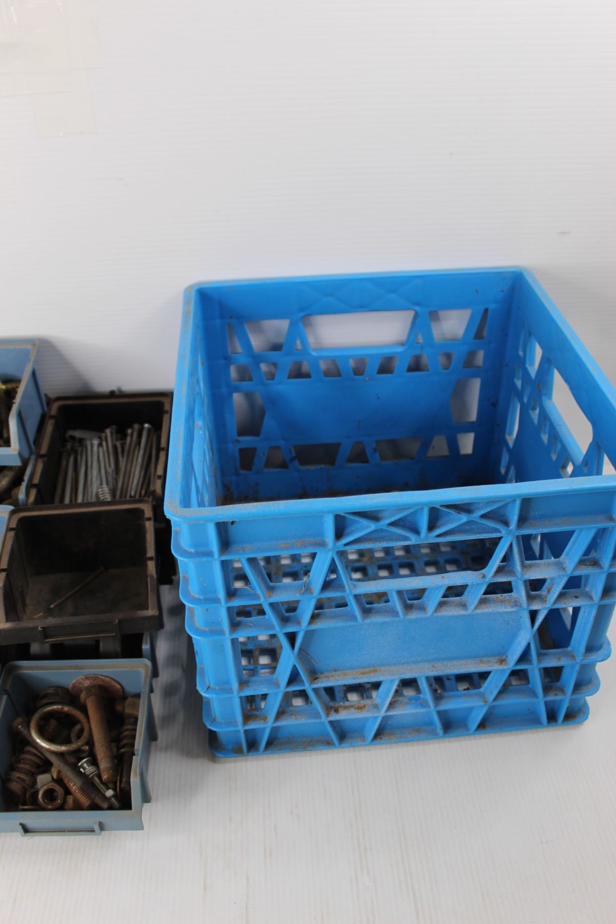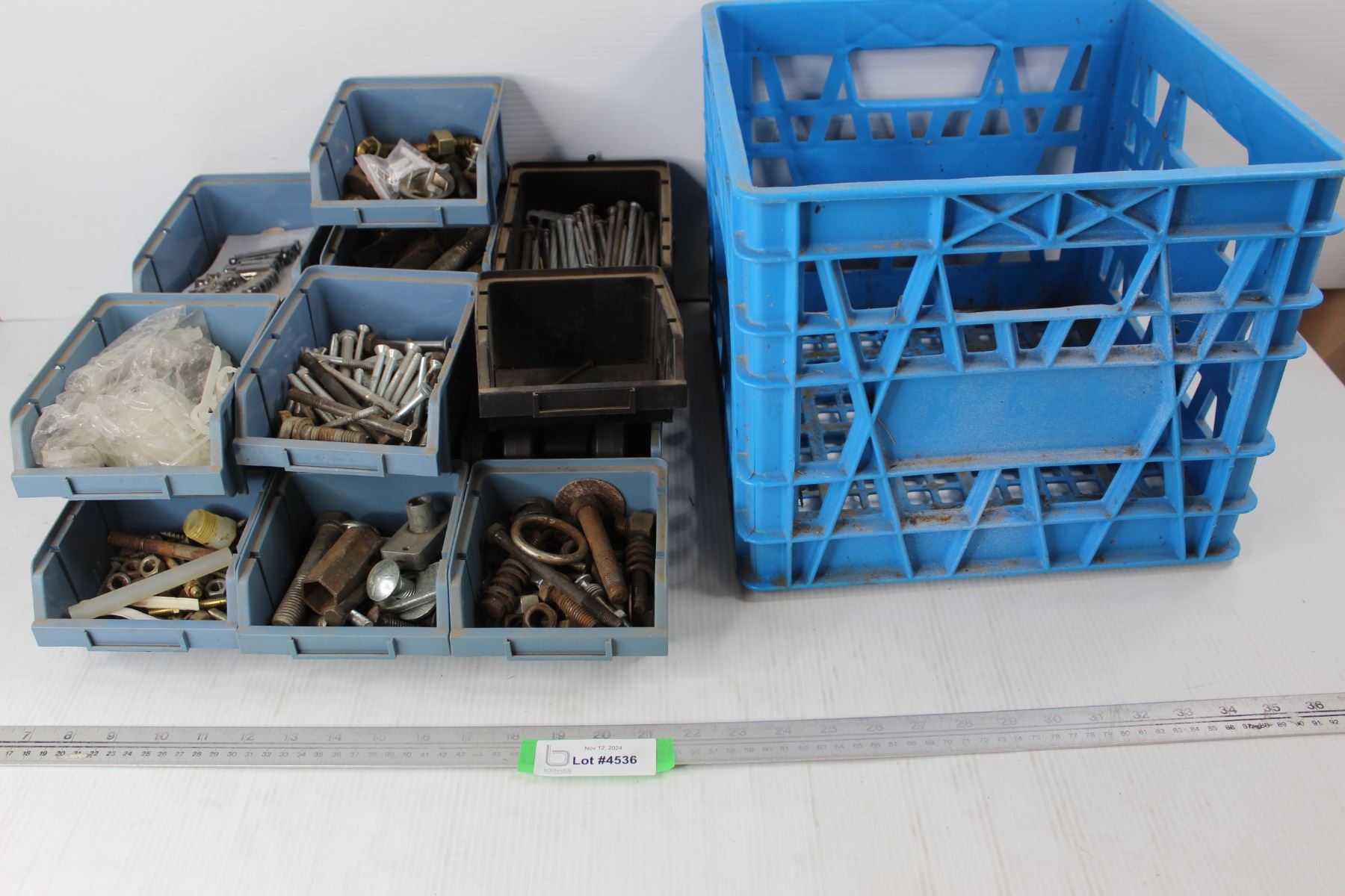 Milk Crate w/ (16) Plastic Stacking Trays w/ Contents, Various Bolts, Bushings, Misc.