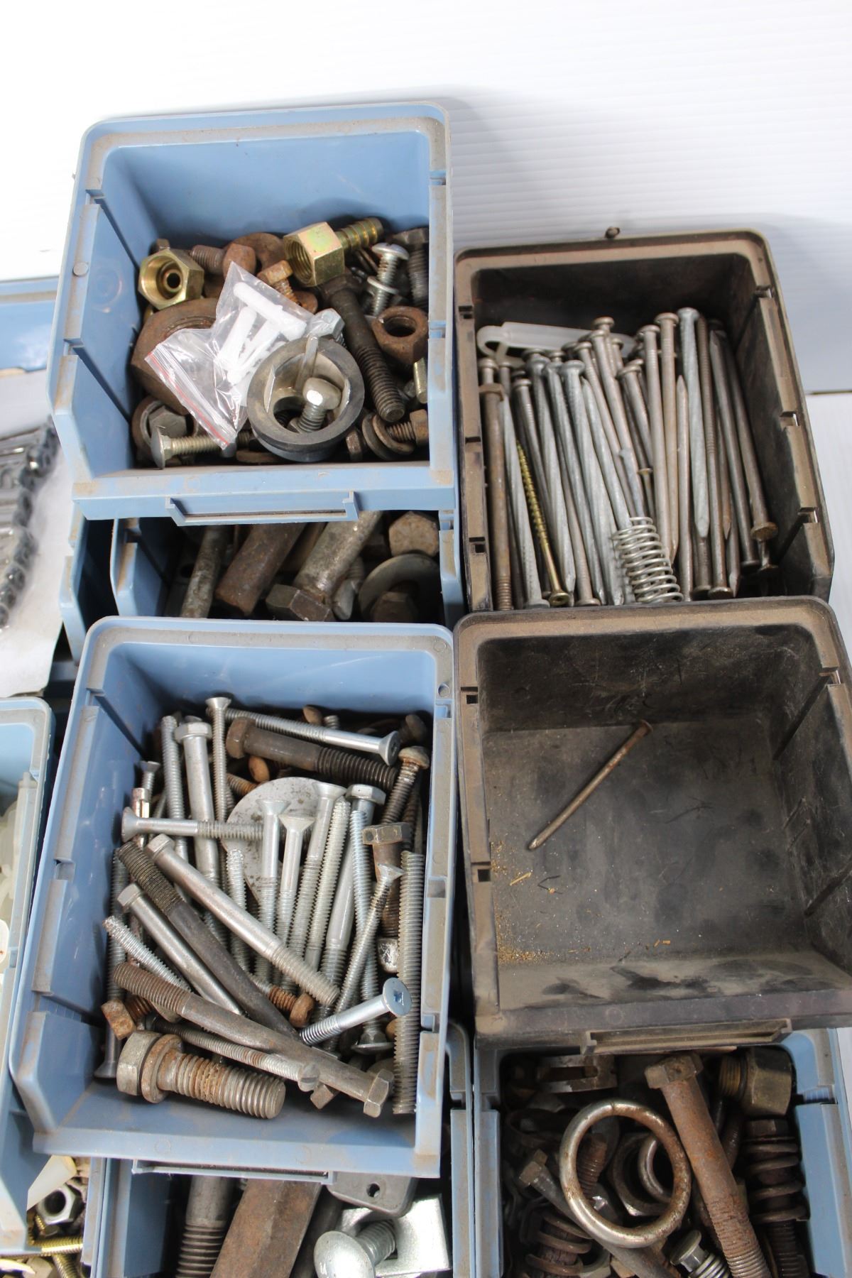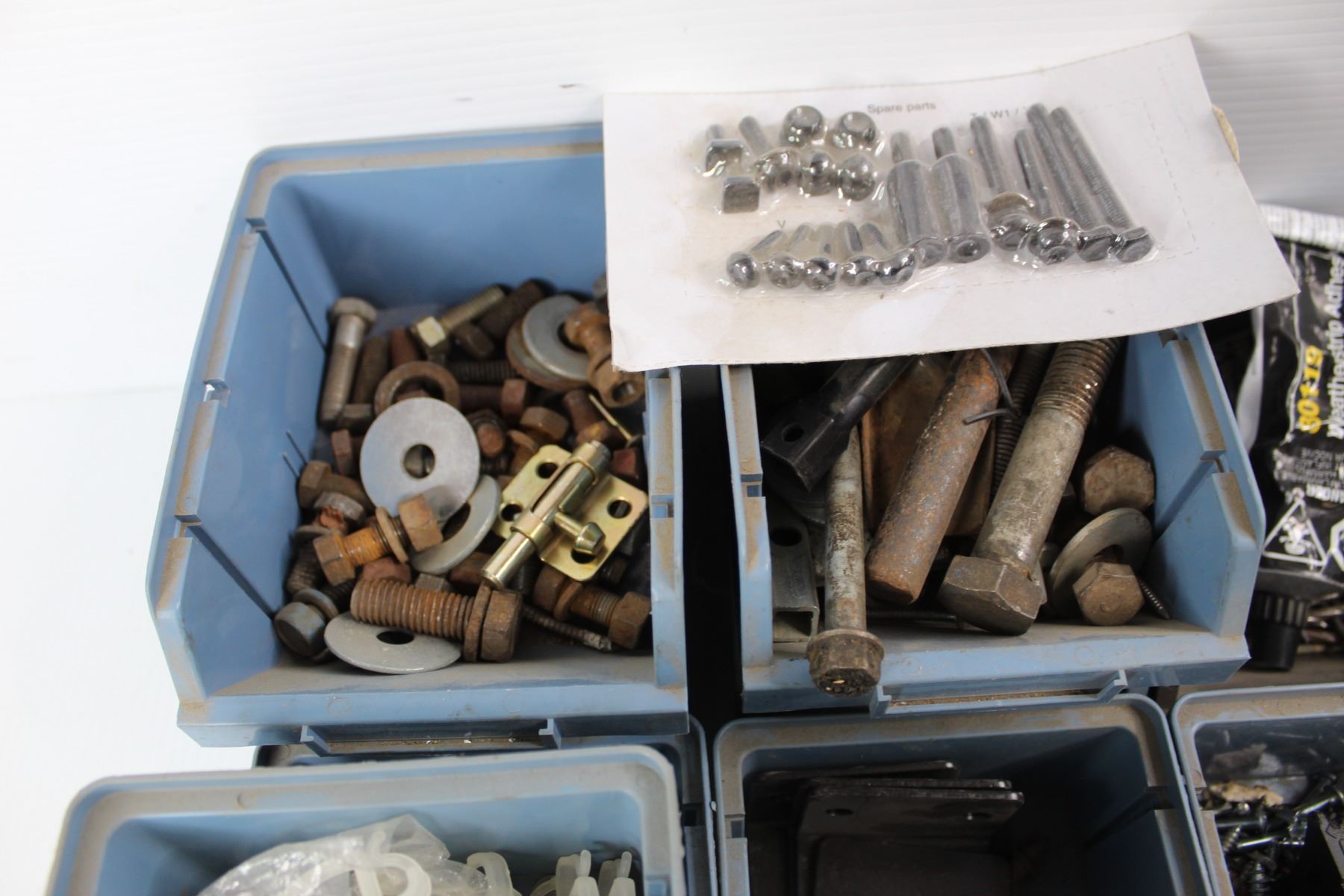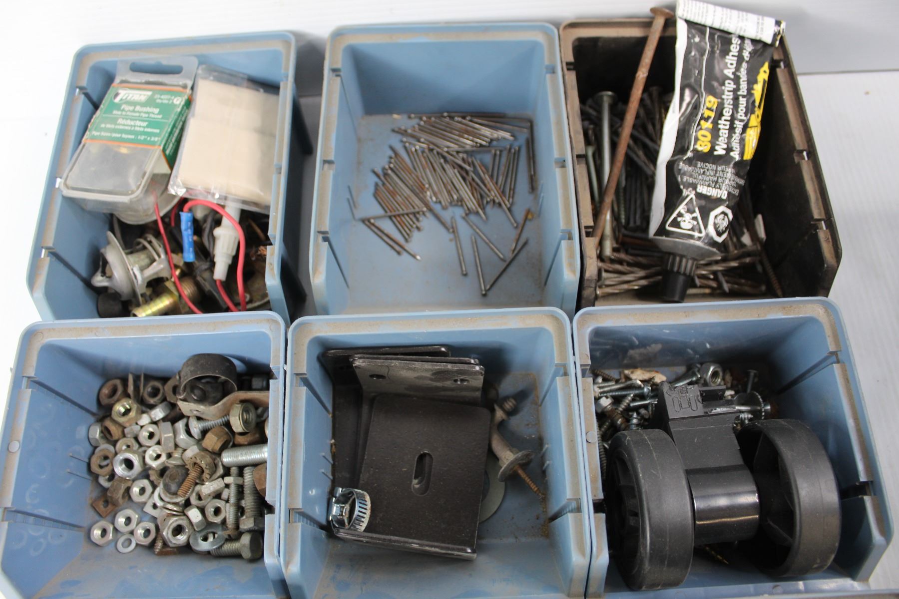 Milk Crate w/ (16) Plastic Stacking Trays w/ Contents, Various Bolts, Bushings, Misc.