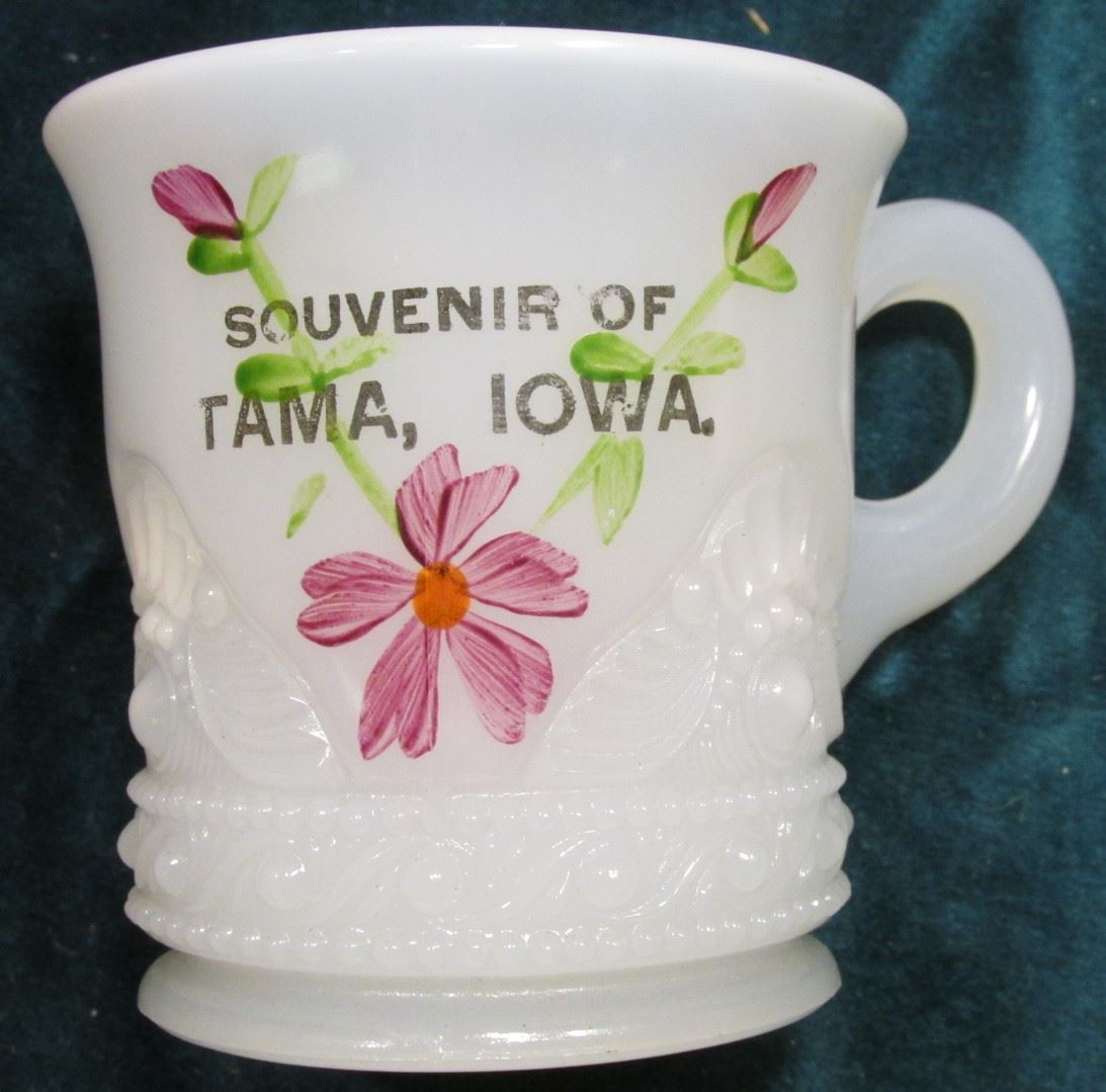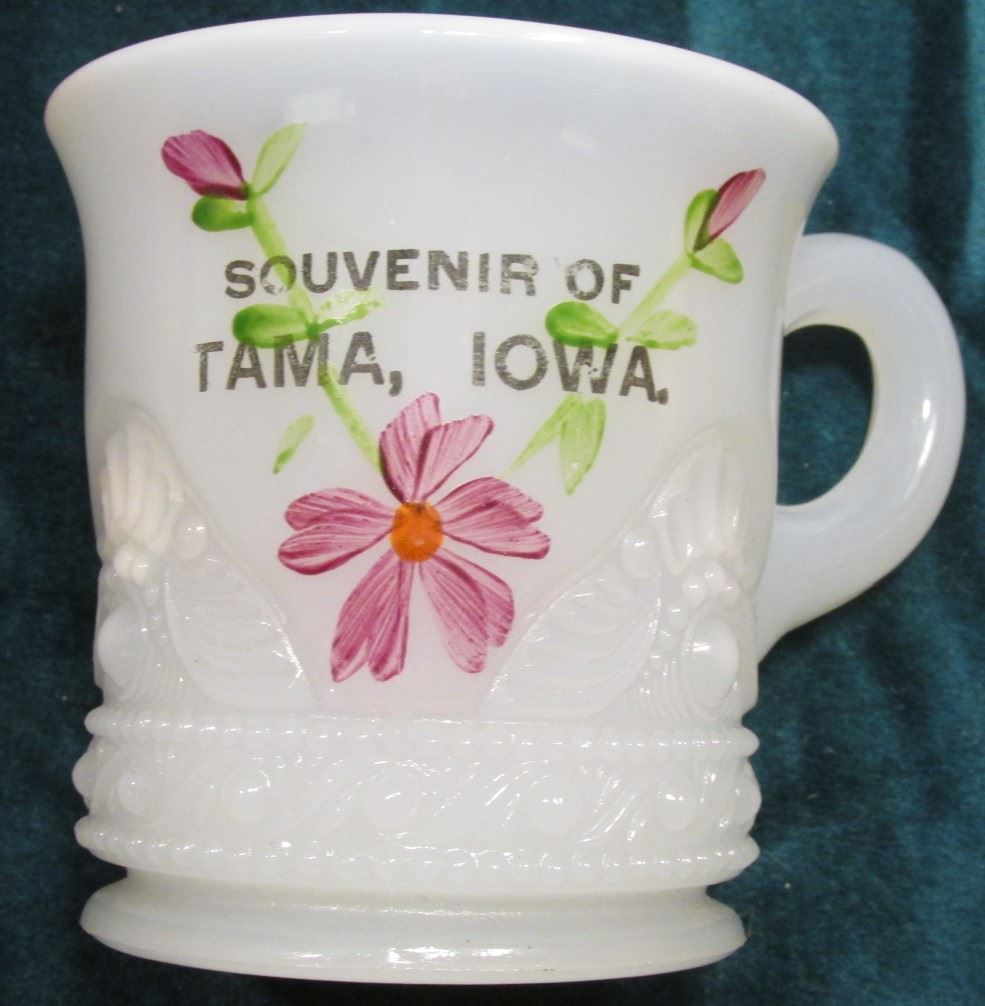Milk Glass Cup "Souvenir of Tama, Iowa." Floral design. No chips or apparent damage.