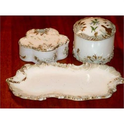 <tr><td>Title:Milk Glass Hand Painted Dresser Set</td></tr>