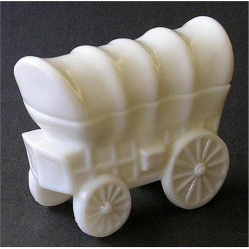 </font></strong>Known as PRAIRIE SCHOONER this opaque White MILK GLASS powder jar is shown and described in Whitmyer: Bedroom & Bathroom Glassware of the Depression Era. Attributed to the KEMPLE Glass Company circa 1945. This large and heavy piece measures 4 7/8 inches tall x 6 1/4 inches long x 2 3/4 inches wide and with the exception of a tiny flake on one corner of a tiny box that sits between wheels on the left side of wagon - the jar is in excellent condition.</font>