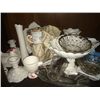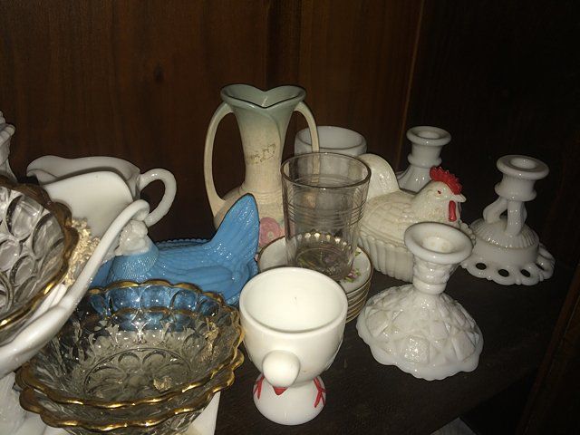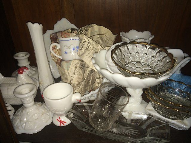 Milk Glass Treasure Trove includes many Westmoreland Glass Co. Milk glass pieces in a variety of patterns, misc. glass including gold rimmed bowl set, procelain pieces, and more!
