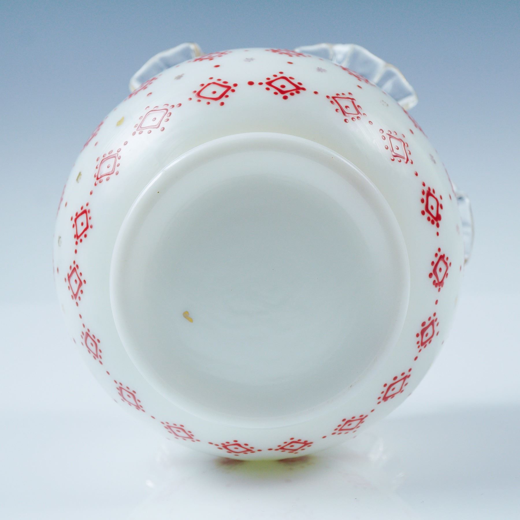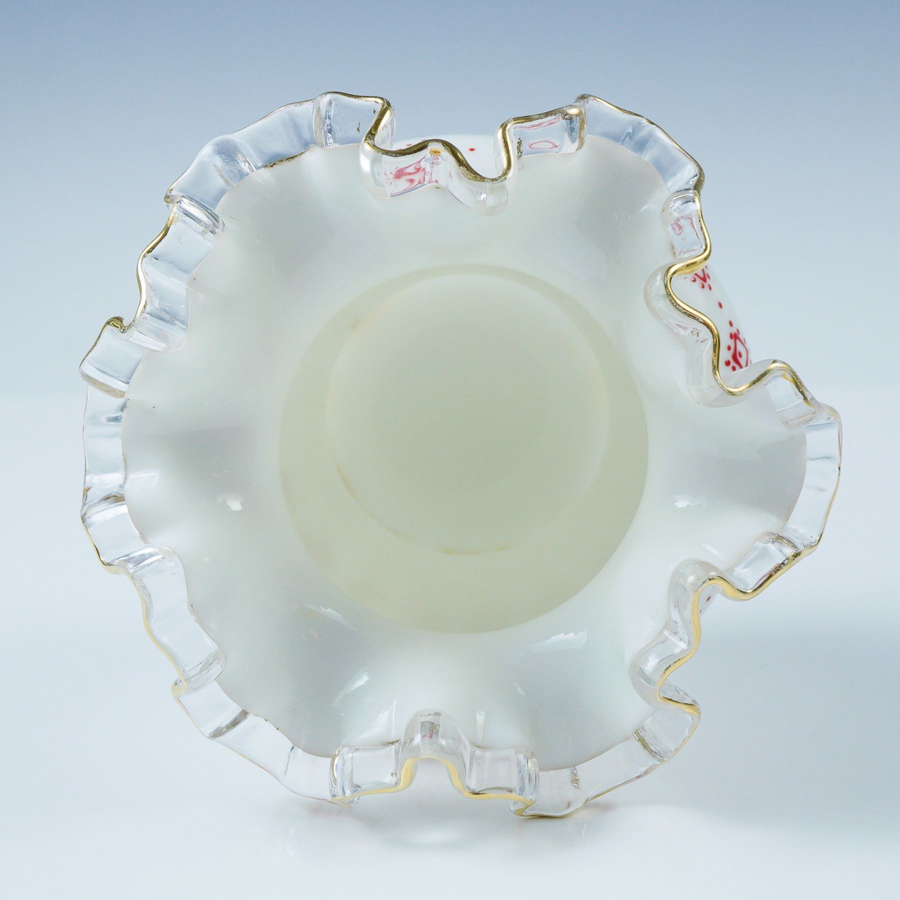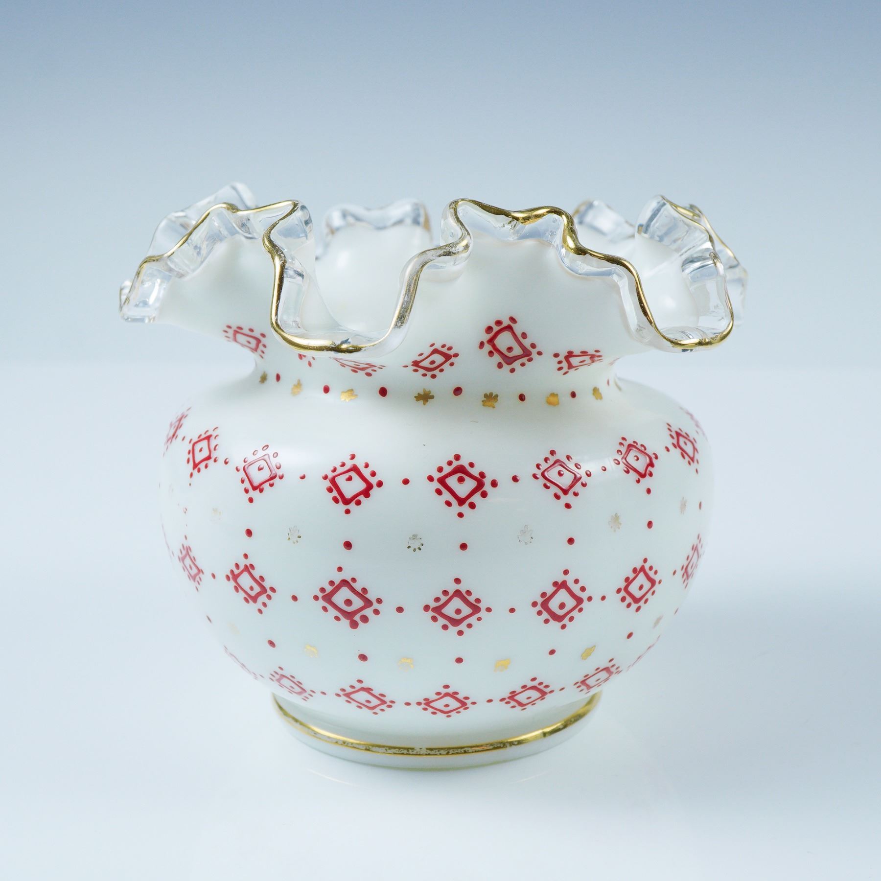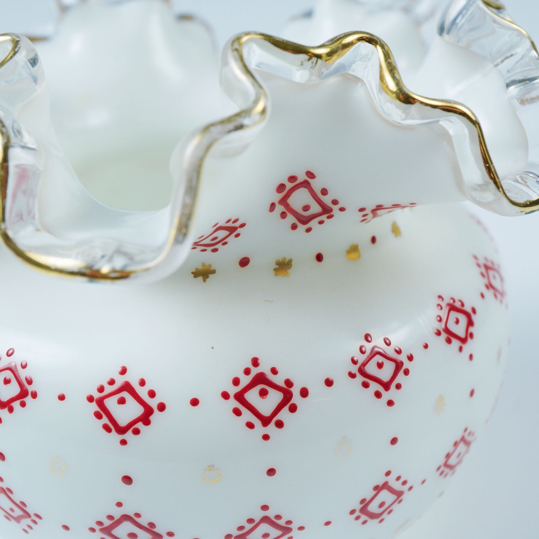 Decorative milk glass vase featuring a stylized red diamond and dot motif, accented by scattered gilt floral elements throughout. The flared crimped rim is trimmed in gold and edged in clear glass, creating a delicate ruffled effect. The bulbous form tapers into a narrow mouth, making it suitable for small floral arrangements or display. An attractive example of vintage hand-decorated opaque glass with a vibrant geometric design.