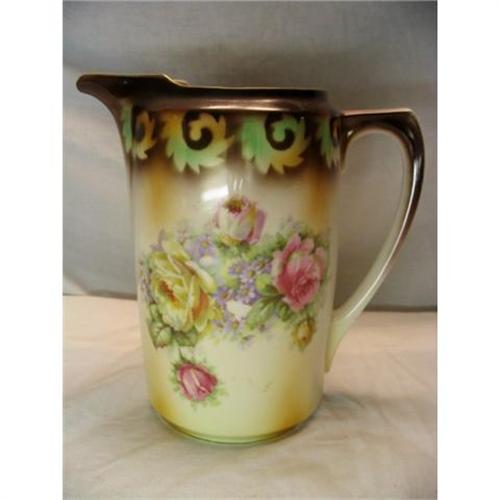 Fully glazed Milk Pitcher with copper/brown shading at bottom and top. Roses painted on sides. Handle is sold, not hollow. No visible defects.