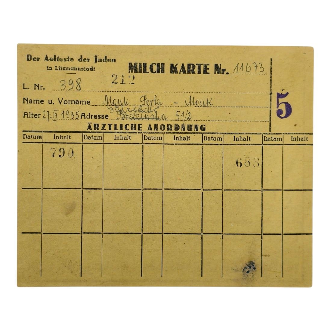 Milk Ration Card for Jewish Child from Lodz Litzmannstadt Ghetto. Recently found in an attic in Germany, these ration cards belonged to children living in the Lodz Ghetto located in Poland. They were distributed by the Jewish city council within the ghetto. These children would all eventually end up in Chelmno Death Camp where they were gassed. Each card has been researched.