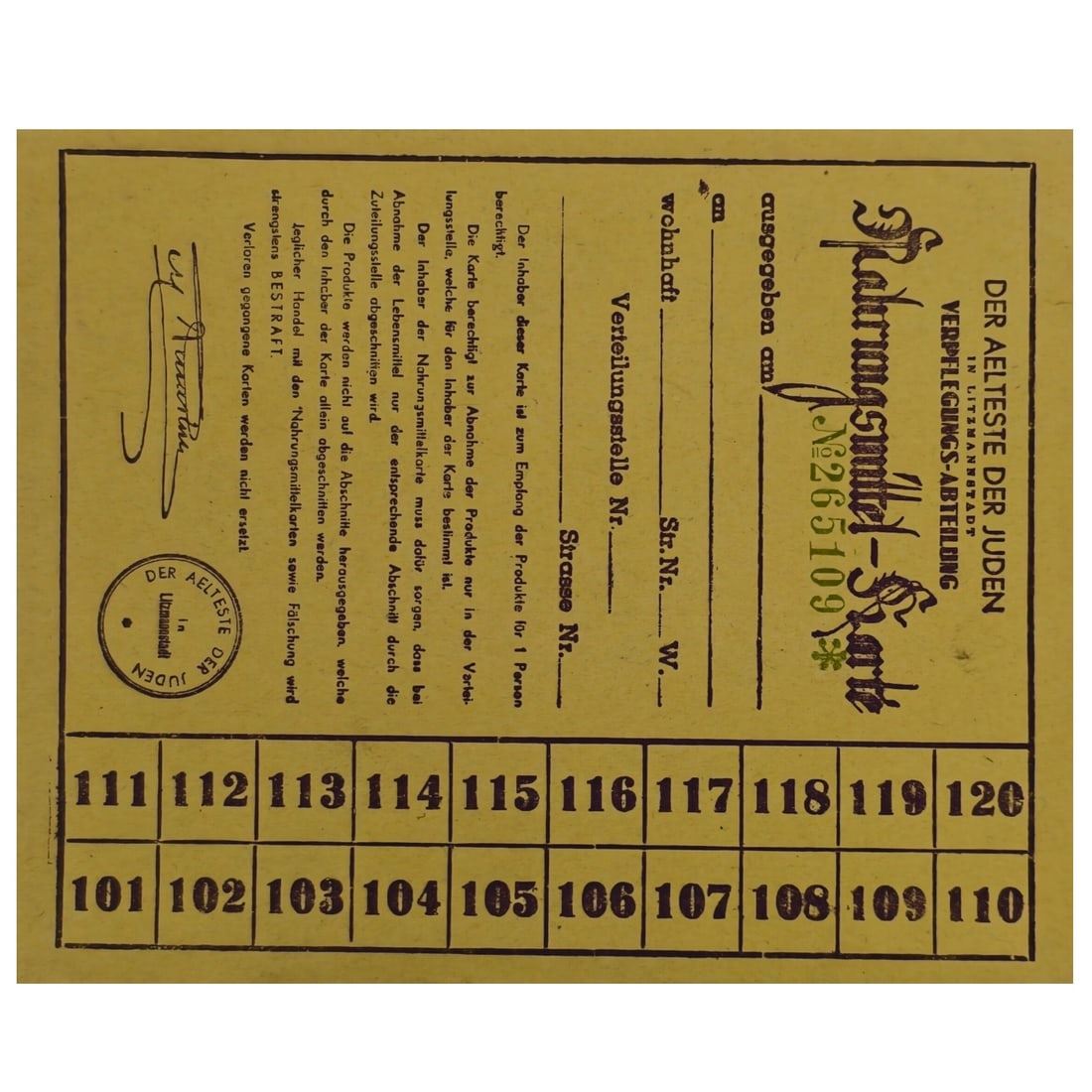 Milk Ration Card for Jewish Child from Lodz Litzmannstadt Ghetto. Recently found in an attic in Germany, these ration cards belonged to children living in the Lodz Ghetto located in Poland. They were distributed by the Jewish city council within the ghetto. These children would all eventually end up in Chelmno Death Camp where they were gassed. Each card has been researched.