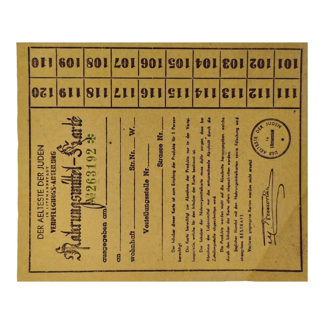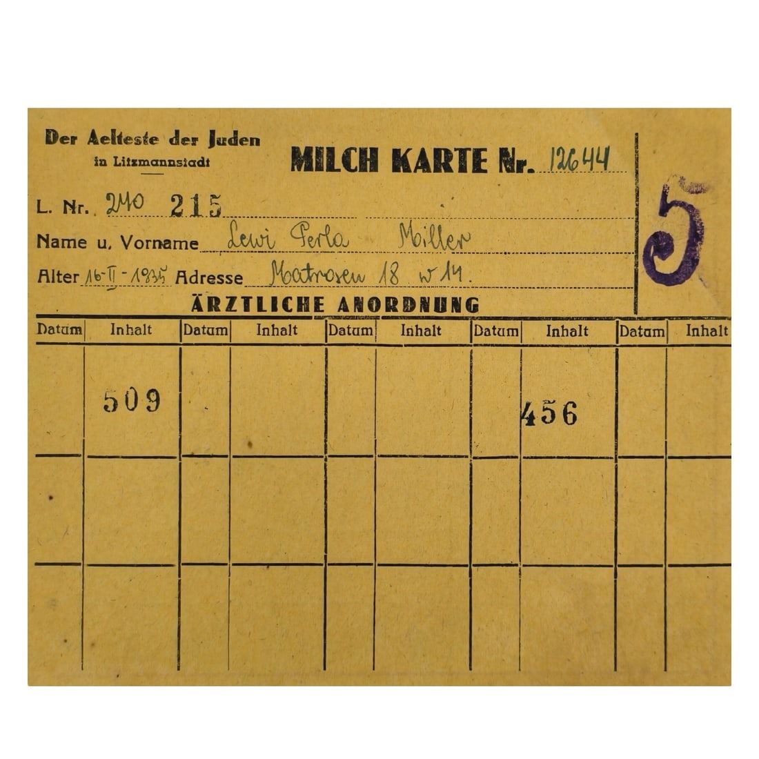 Milk Ration Card for Jewish Child from Lodz Litzmannstadt Ghetto. Recently found in an attic in Germany, these ration cards belonged to children living in the Lodz Ghetto located in Poland. They were distributed by the Jewish city council within the ghetto. These children would all eventually end up in Chelmno Death Camp where they were gassed. Each card has been researched.