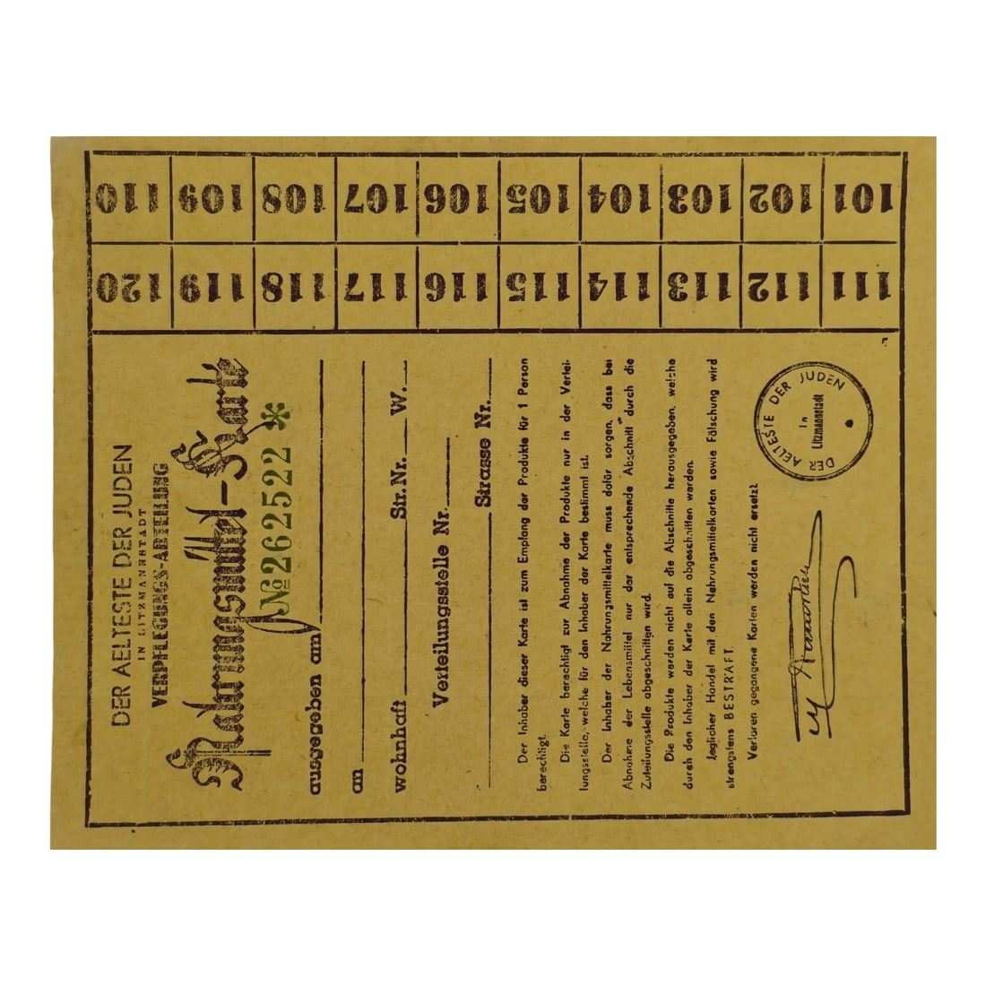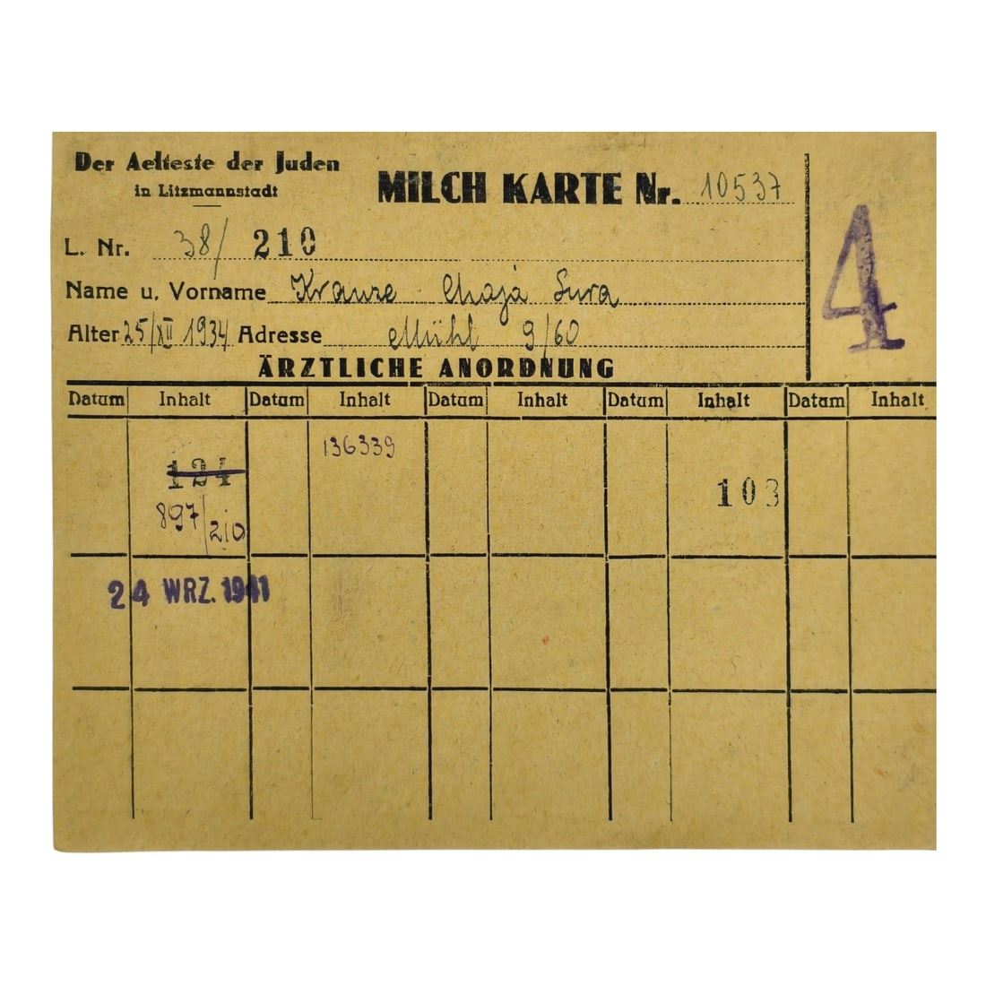 Milk Ration Card for Jewish Child from Lodz Litzmannstadt Ghetto. Recently found in an attic in Germany, these ration cards belonged to children living in the Lodz Ghetto located in Poland. They were distributed by the Jewish city council within the ghetto. These children would all eventually end up in Chelmno Death Camp where they were gassed. Each card has been researched.