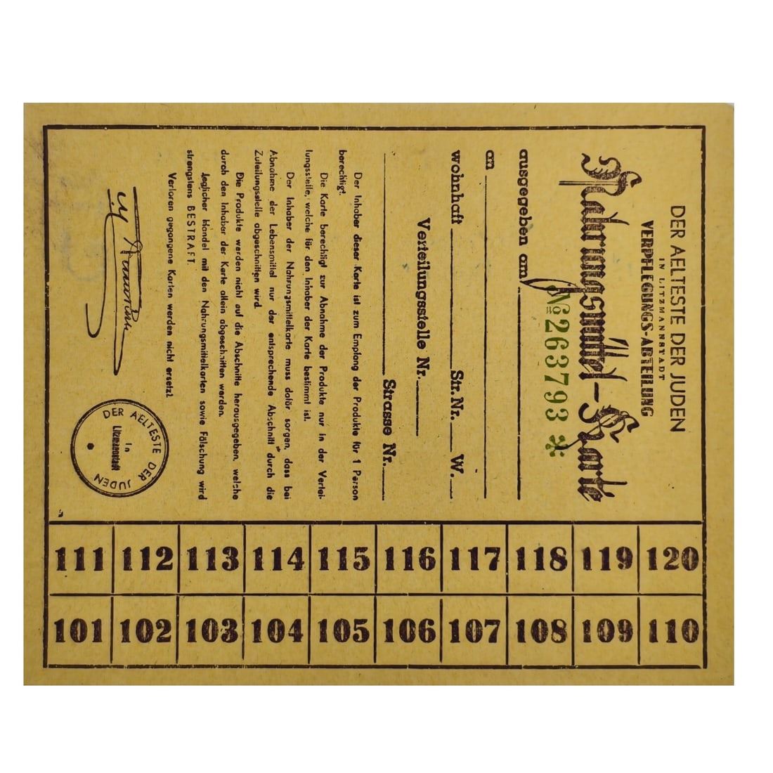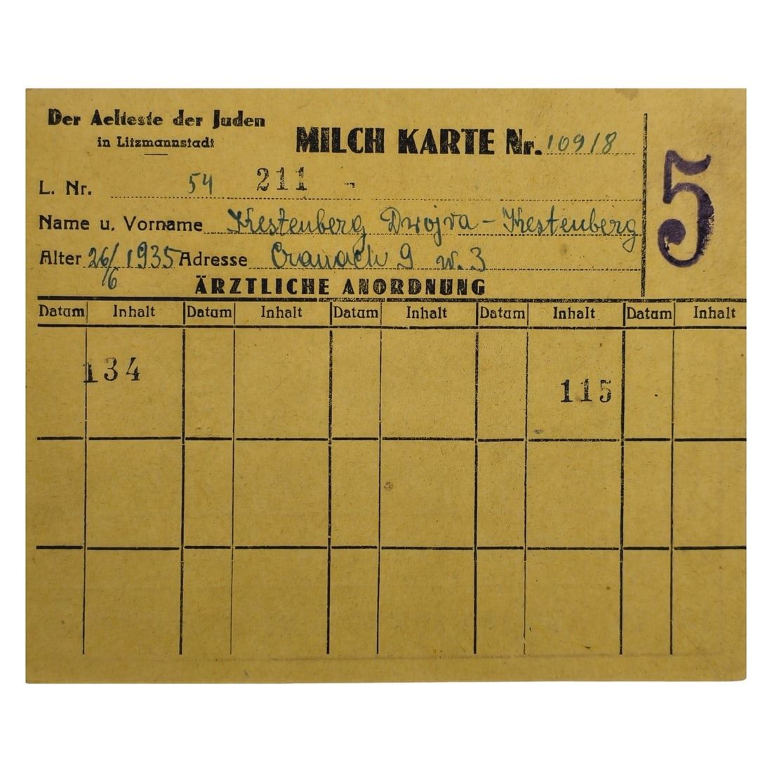 Milk Ration Card for Jewish Child from Lodz Litzmannstadt Ghetto. Recently found in an attic in Germany, these ration cards belonged to children living in the Lodz Ghetto located in Poland. They were distributed by the Jewish city council within the ghetto. These children would all eventually end up in Chelmno Death Camp where they were gassed. Each card has been researched.