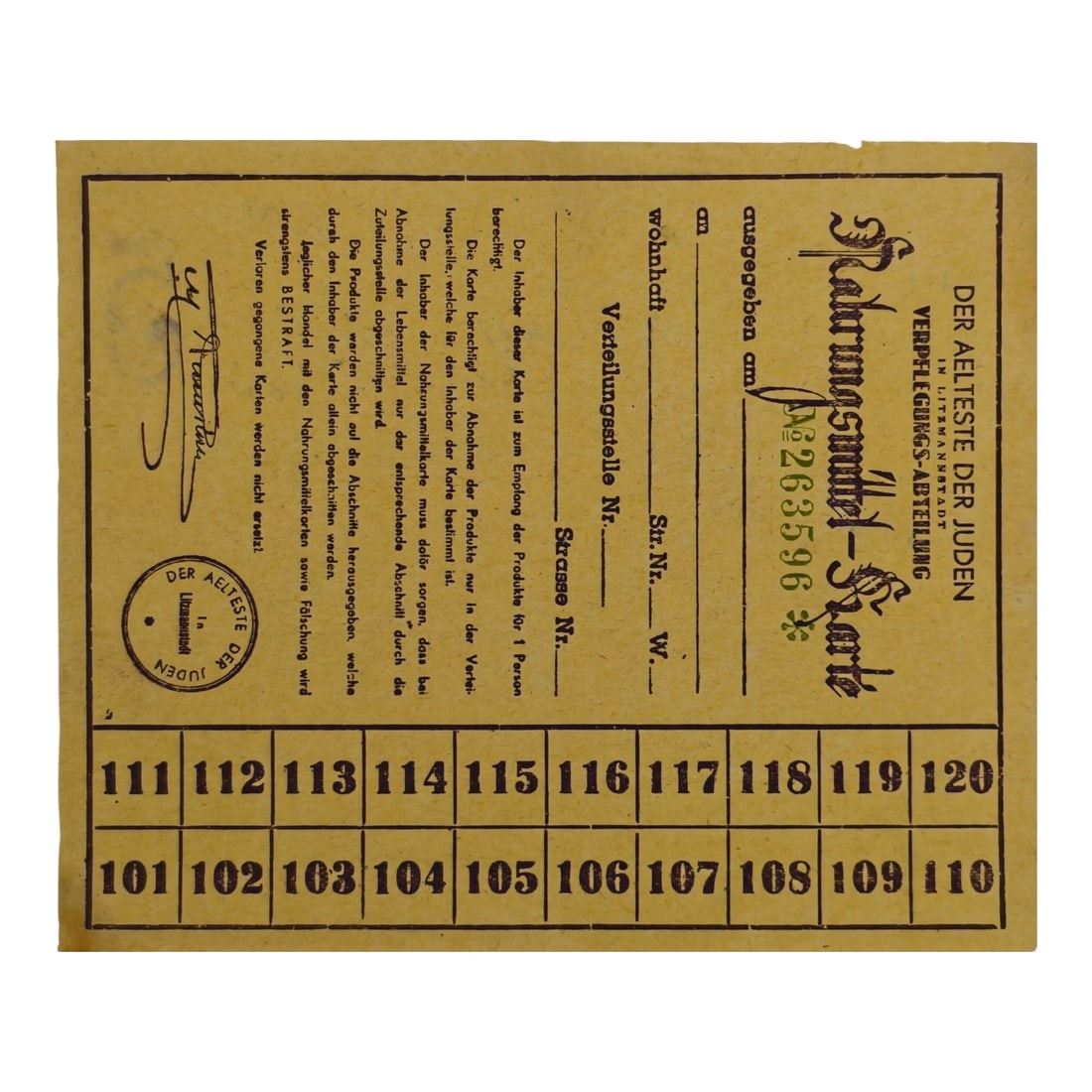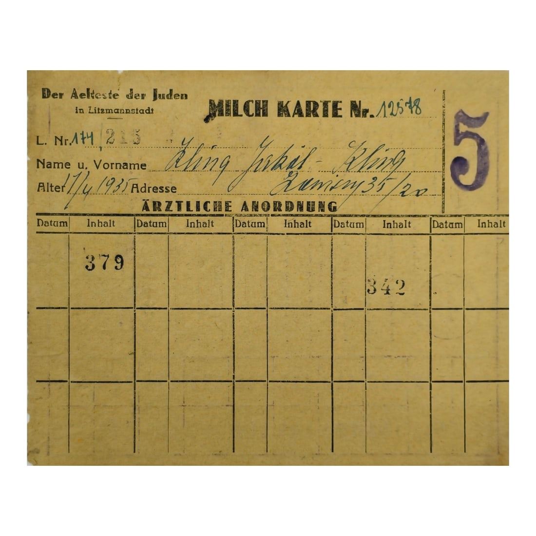 Milk Ration Card for Jewish Child from Lodz Litzmannstadt Ghetto. Recently found in an attic in Germany, these ration cards belonged to children living in the Lodz Ghetto located in Poland. They were distributed by the Jewish city council within the ghetto. These children would all eventually end up in Chelmno Death Camp where they were gassed. Each card has been researched.