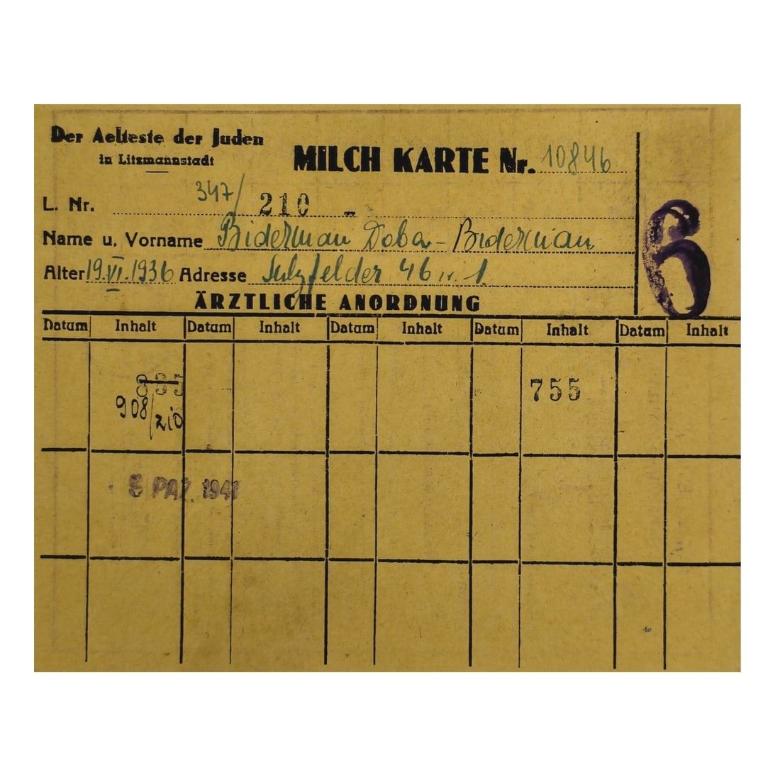 Milk Ration Card for Jewish Child from Lodz Litzmannstadt Ghetto