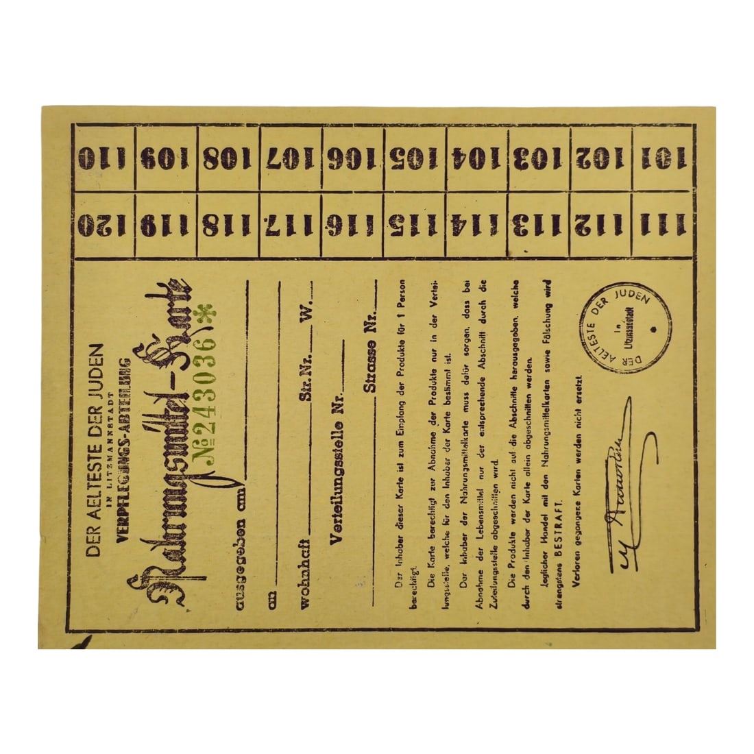 Milk Ration Card for Jewish Child from Lodz Litzmannstadt Ghetto. Recently found in an attic in Germany, these ration cards belonged to children living in the Lodz Ghetto located in Poland. They were distributed by the Jewish city council within the ghetto. These children would all eventually end up in Chelmno Death Camp where they were gassed. Each card has been researched.