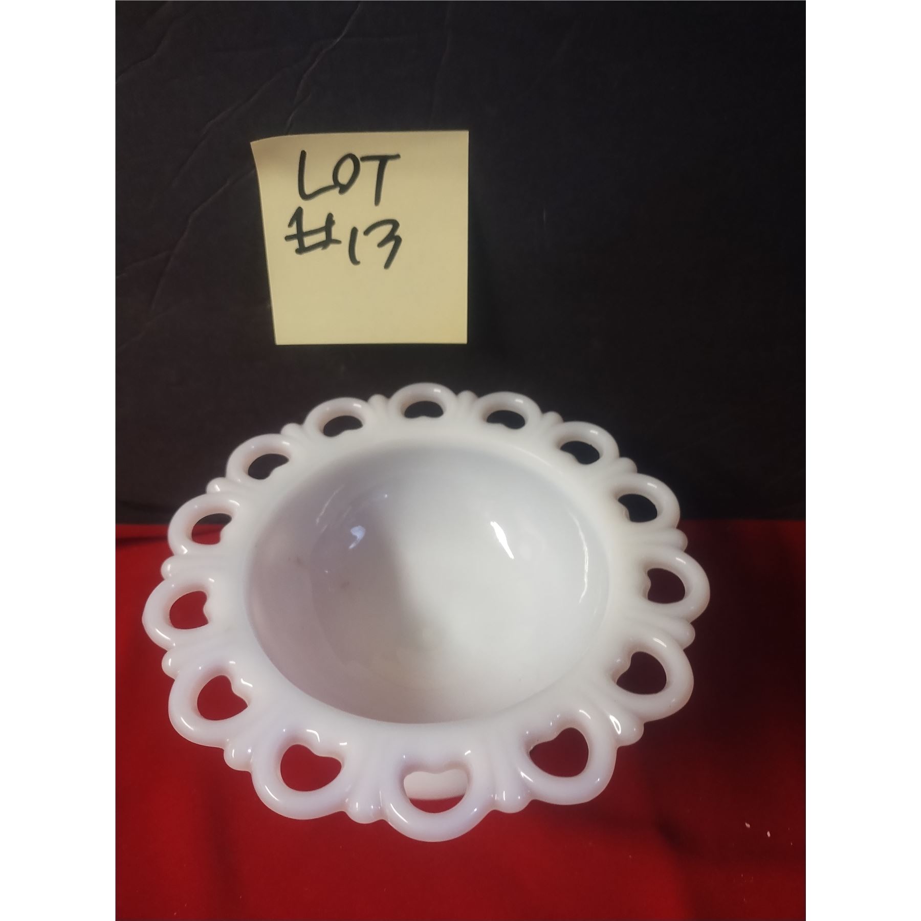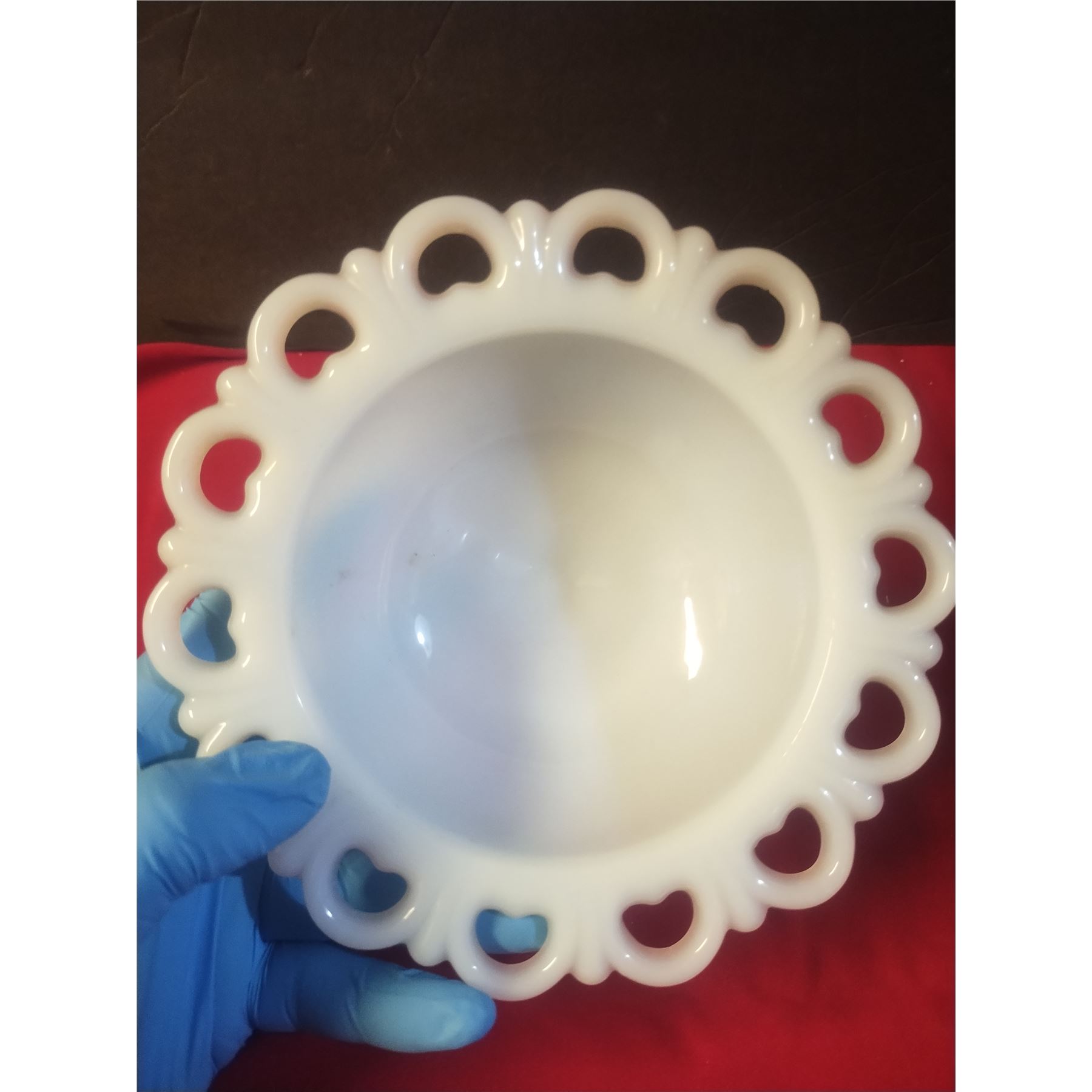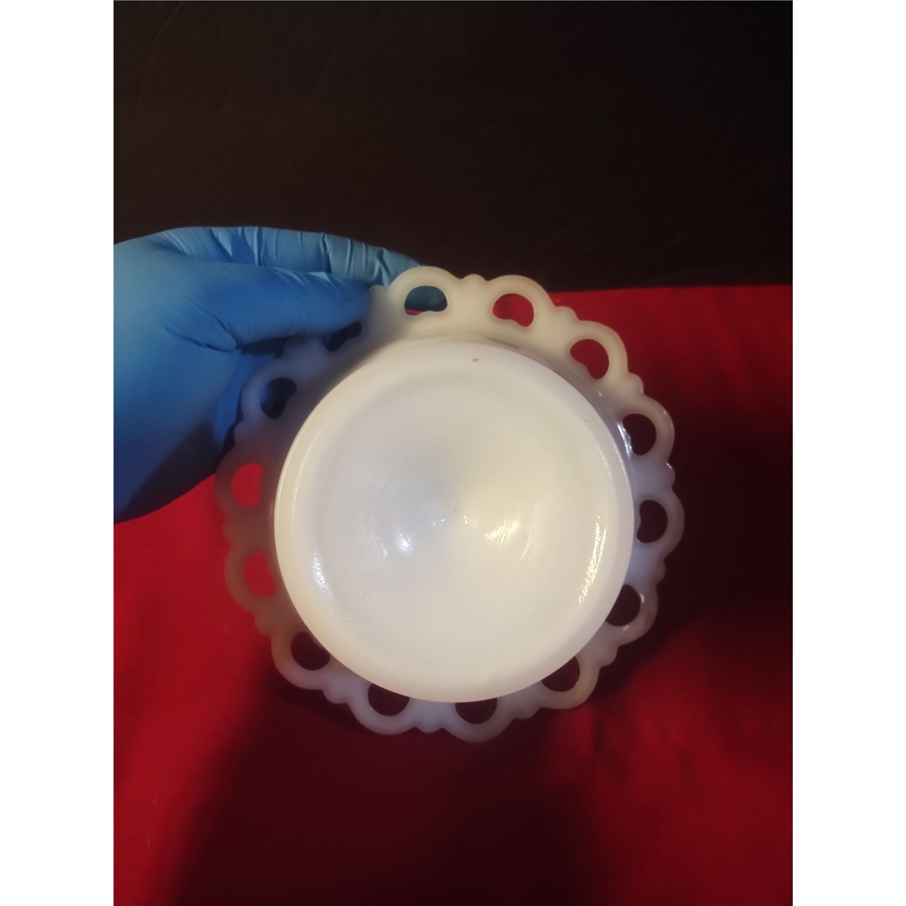 Beautiful milk white vintage candy dish, 4 inches tall, 7 inches in diameter.