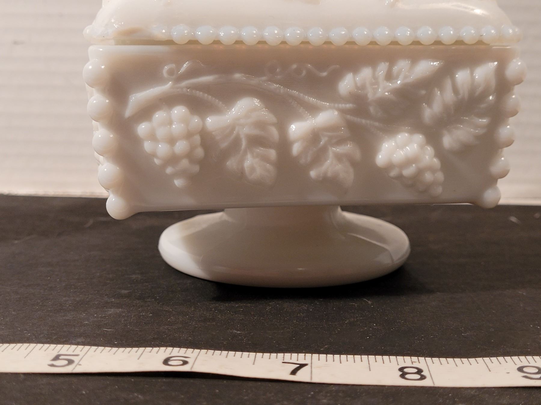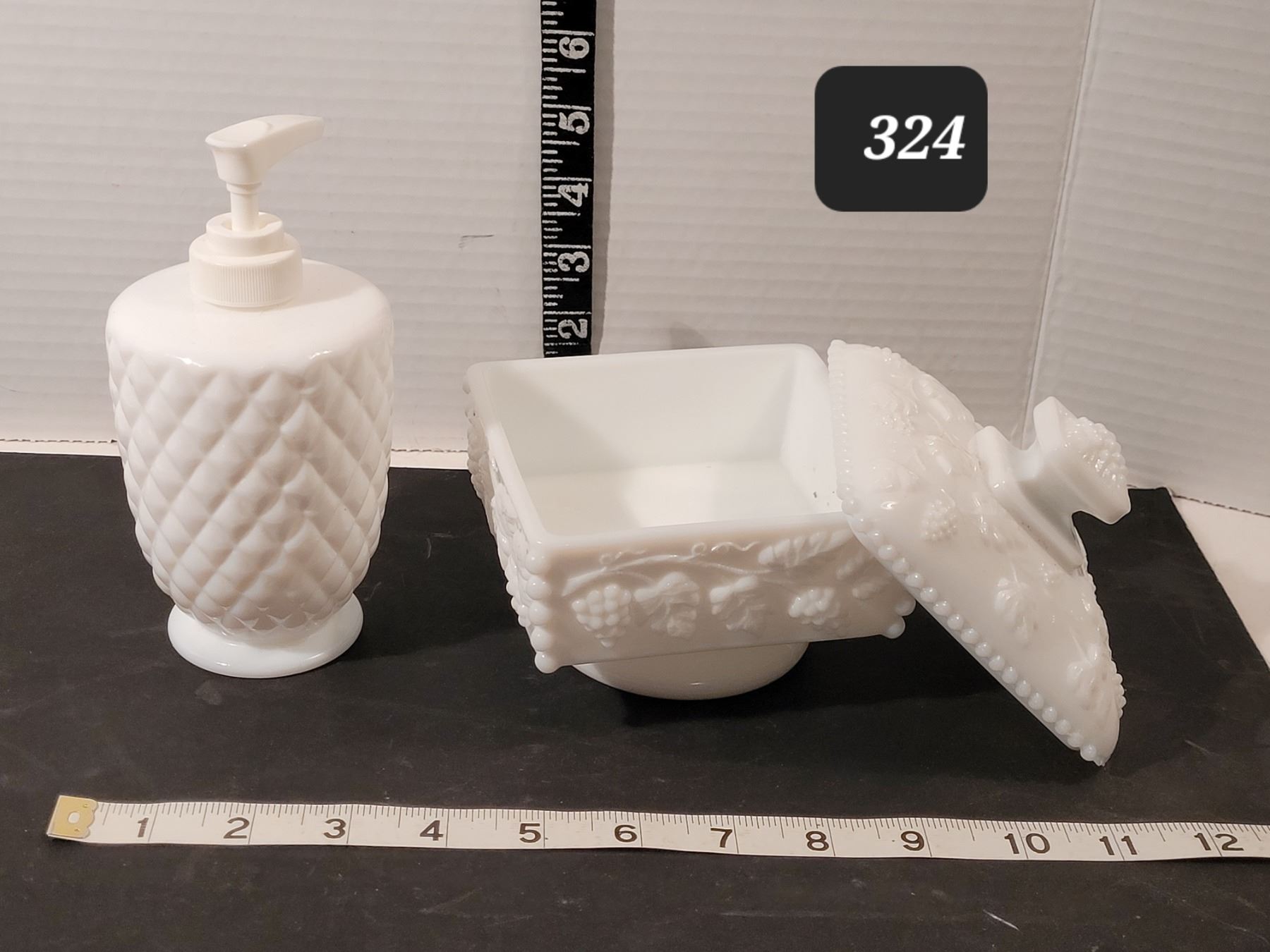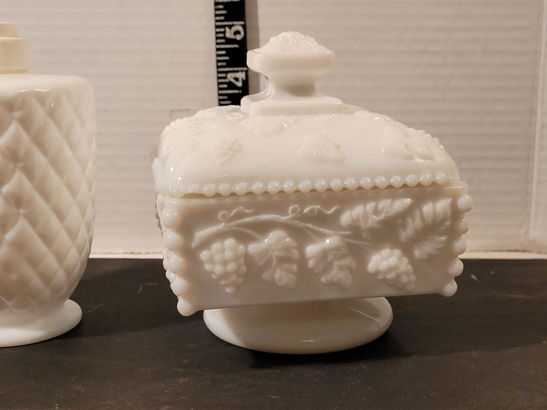 Milk glass lidded grape design dish (chipped corner) & lotion pump.